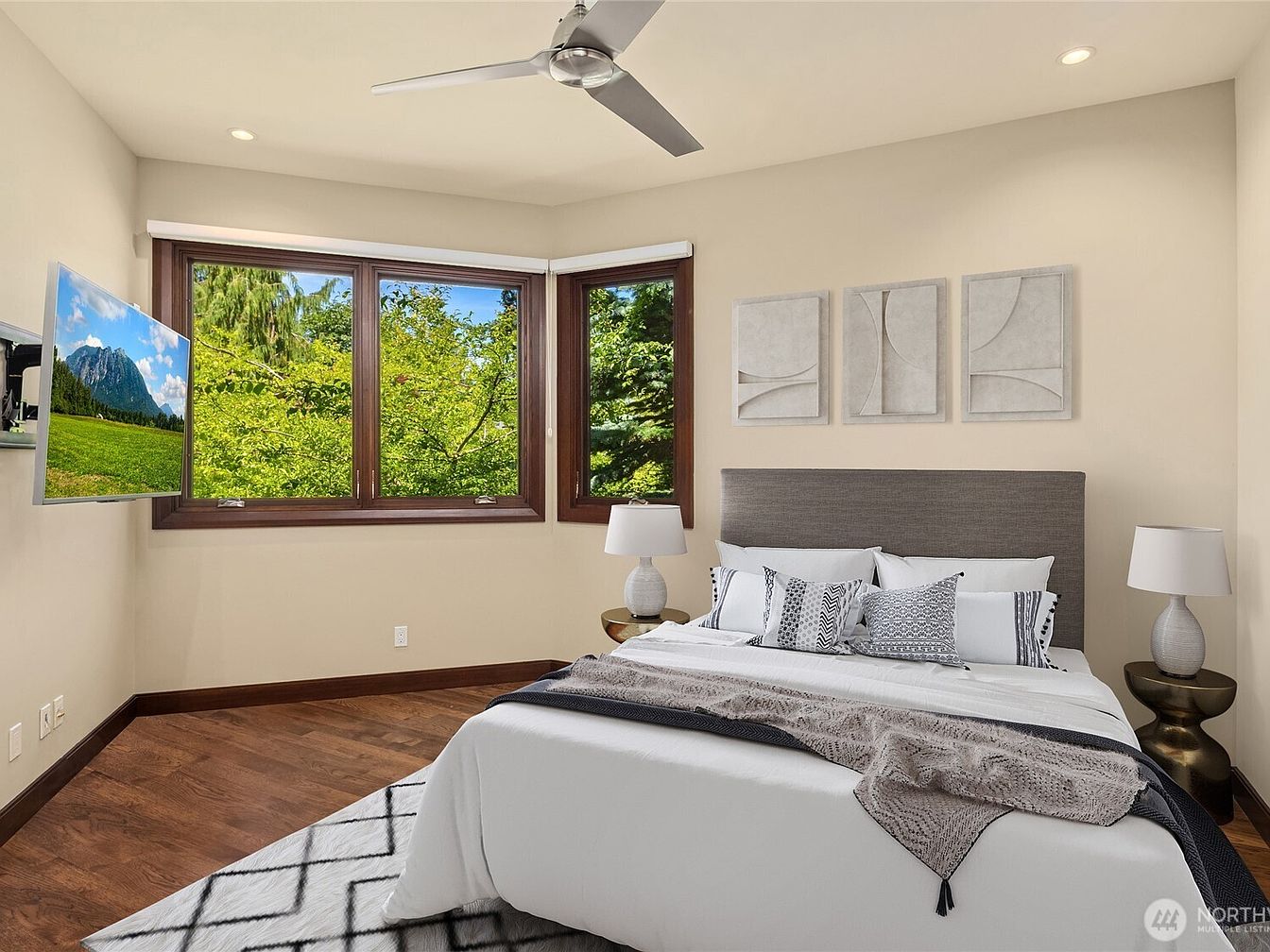 Natural light floods this tranquil bedroom through expansive corner windows framed in dark wood, offering lush green views that create a serene atmosphere. The room features a minimalist layout with a plush gray upholstered bed, crisp white bedding, and coordinating accent pillows that enhance comfort and family-friendly relaxation. Warm hardwood floors are complemented by a soft geometric rug, and two stylish bedside tables with modern lamps add functionality and symmetry. Neutral-toned walls accentuate the room’s calming aesthetic, while abstract wall art adds visual interest. A ceiling fan ensures comfort, and a wall-mounted TV completes this inviting, restful space.