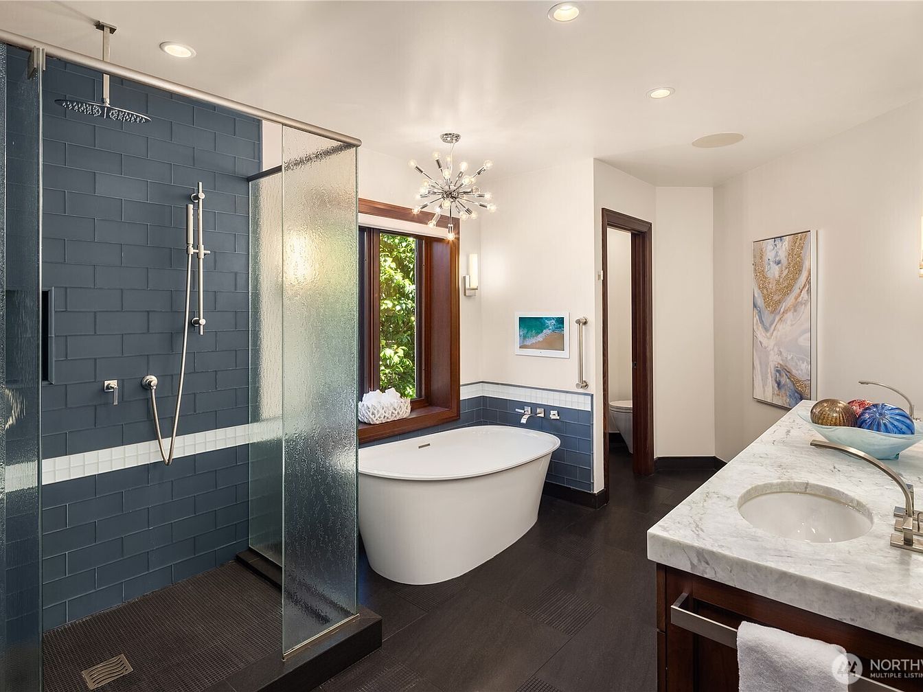 A contemporary bathroom offers a serene escape with a freestanding soaking tub positioned beside large windows that fill the space with natural light. The walk-in shower features frosted glass panels and deep navy subway tile, creating a calming, spa-like atmosphere. Sleek, dark flooring contrasts with white marble countertops and rich wooden cabinetry, while playful art and decorative glass orbs add personality. A starburst chandelier and wall sconces contribute to a bright, welcoming ambiance. Family-friendly details include spacious layouts, grab bars for safety, and durable materials that balance style with function for everyday use.