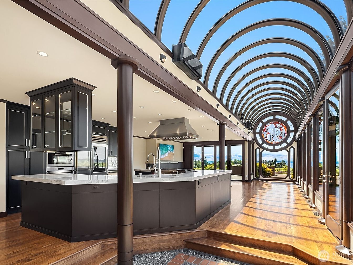 An open-plan kitchen seamlessly connects with a bright sunroom, offering stunning panoramic views through floor-to-ceiling arched glass windows. The kitchen features a spacious marble-topped island, dark cabinetry with minimalist silver accents, and top-tier stainless steel appliances, creating an elegant and functional space for family gatherings. The sunroom adds a dramatic architectural touch with its soaring glass ceiling and circular stained glass detail, flooding the space with natural light. Warm-toned hardwood floors and classic dark wood accents throughout make this an inviting, family-friendly area perfect for cooking, dining, and enjoying the outdoors year-round.