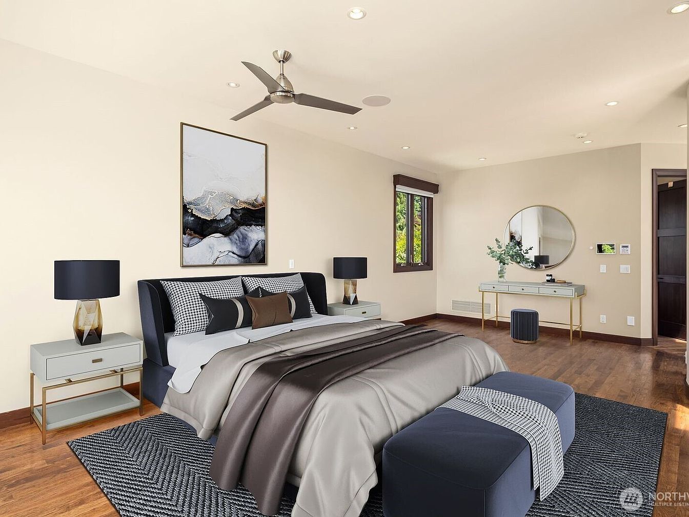 Spacious and serene, this master bedroom features a soothing neutral color palette accented by deep navy and rich brown tones. The king-sized bed is framed by modern nightstands and elegant black-shaded lamps, while geometric patterns add sophistication to the pillows and area rugs. A stylish vanity with a round mirror and gold accents enhances the room’s functionality, perfect for family routines. Natural light streams through the window, creating a welcoming environment. Warm hardwood floors and simple architectural lines maintain a contemporary, clutter-free look, making it ideal for both relaxation and accommodating the needs of a modern family.