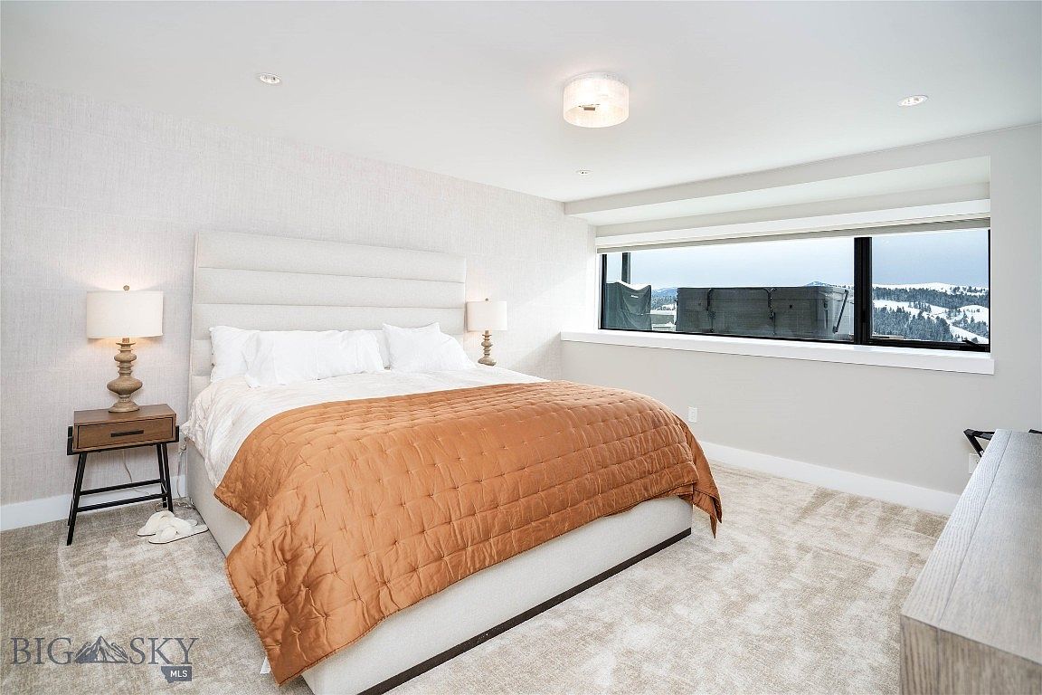 This serene master bedroom features an elegant and modern design with soothing tones. A plush, cream-colored upholstered bed is adorned with soft, textured pillows and a rich, olive green duvet that adds a touch of warmth. Light wallpaper complements the natural light flooding in through the expansive black-framed window, showcasing stunning views of the snowy landscape outside. Sleek nightstands with mirrored surfaces and minimalist lamps add chic practicality. The room’s cozy carpet enhances the inviting atmosphere, making it perfect for relaxation. Architectural details, such as recessed lighting and a stylish ceiling fixture, elevate its contemporary appeal.