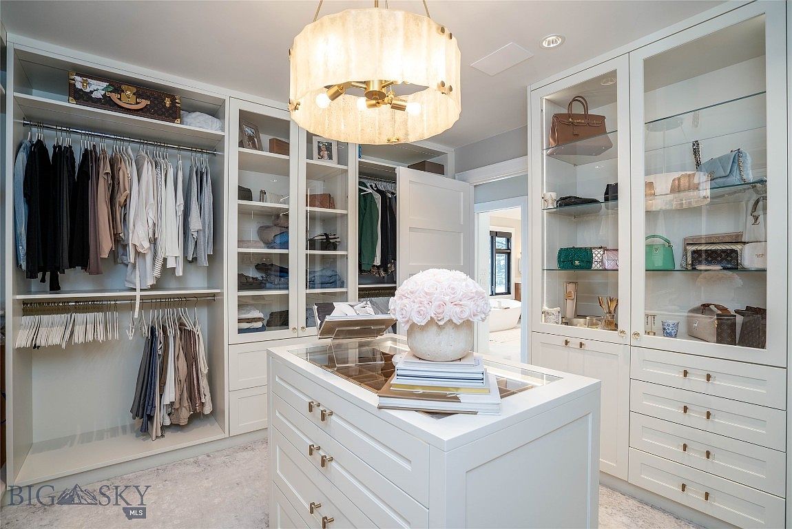 Spacious and impeccably organized, this walk-in closet blends function with sophistication. A central island showcases stylish accessories and offers a convenient surface for planning outfits. Elegant cabinetry features glass doors displaying high-end handbags, while neatly hung clothes bring order to the space. Soft gray walls provide a soothing backdrop, complemented by luxurious white cabinetry. The stunning pendant light adds a modern touch, illuminating the entire area with a warm glow. Ample storage solutions cater to a family’s needs, ensuring every item is within reach, creating an inviting personal retreat that emphasizes both style and practicality.