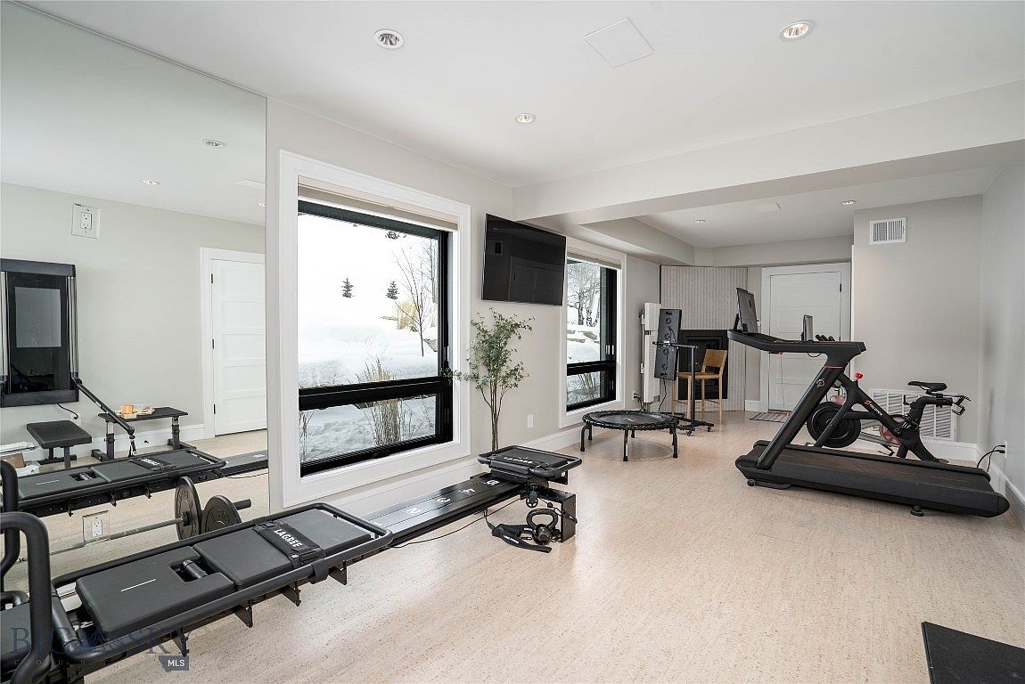 An inviting home gym emphasizes a sleek design with large windows framing a winter landscape, allowing natural light to flood the space. The neutral color palette, highlighted by calming gray walls and light-colored flooring, creates a serene atmosphere. Fitness equipment, including a treadmill and an adjustable reformer, are strategically arranged for optimal use, while a wall-mounted TV adds entertainment options. A touch of greenery accents the room and adds a refreshing feel. This versatile area blends functionality with comfort, making it ideal for family use, encouraging an active lifestyle while being visually appealing.