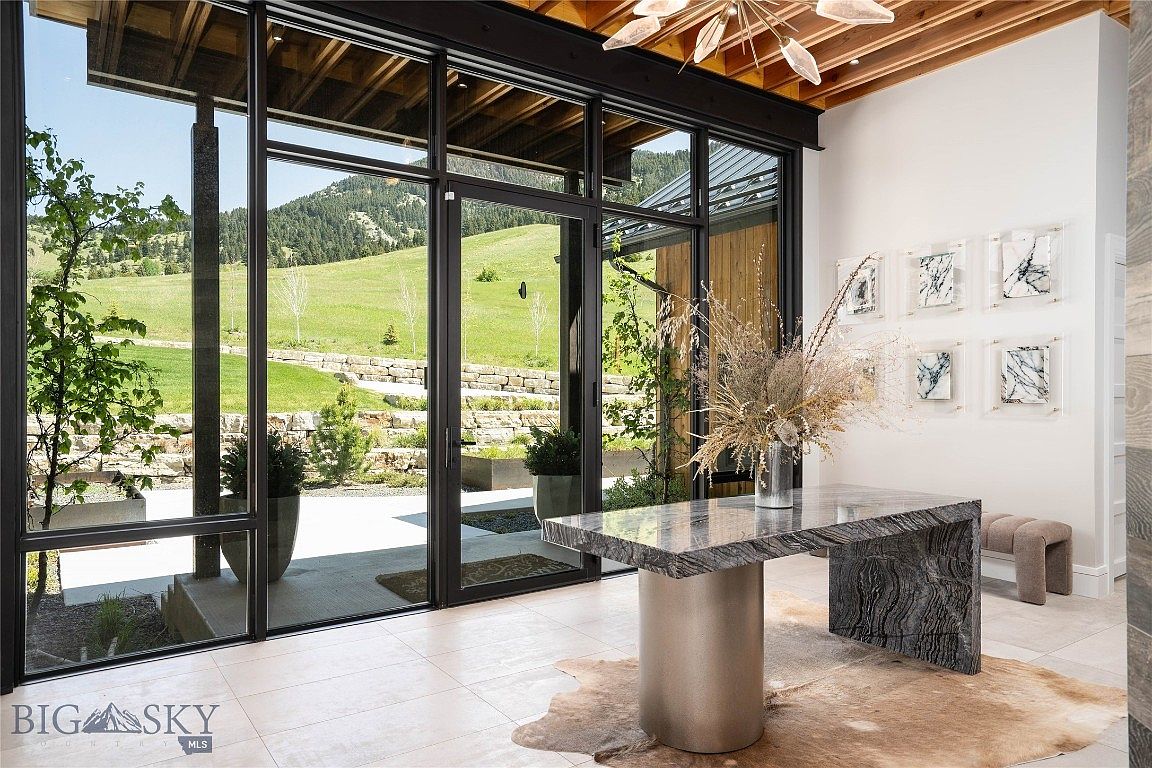 This stunning entryway features an expansive wall of glass that invites natural light, offering breathtaking views of the surrounding landscape. The sleek granite table stands as a centerpiece, complemented by a modern metallic base, creating a striking focal point. A neutral color palette of soft tans and whites enhances the airy feel, while contemporary decor elements, including framed art and natural flora, add charm. The high vaulted wooden ceiling introduces warmth, echoing a rustic charm. Functional and aesthetically pleasing, this space effortlessly blends sophistication with family-friendly design, welcoming guests with an inviting atmosphere.