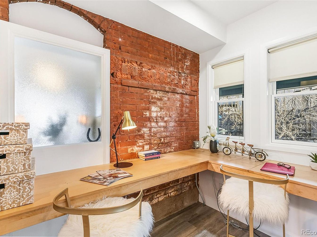 This charming home office nook features a beautiful blend of rustic and modern aesthetics, highlighted by exposed red brick walls that create a warm, inviting atmosphere. A spacious wooden desk offers ample workspace, complemented by stylish gold-accented chairs, adding a touch of elegance. Large windows flood the area with natural light, while simple roller shades provide privacy. Decorative elements include neatly stacked storage boxes and a small bicycle model, interjecting whimsy into the design. The overall color palette, primarily neutral with hints of warm tones, fosters a cohesive, family-friendly environment perfect for productivity and creativity.