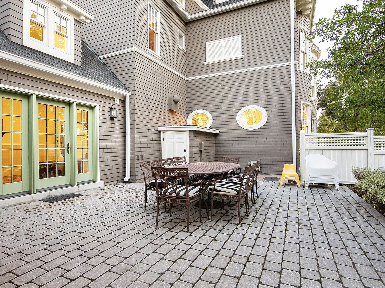 This inviting outdoor patio features a spacious stone-paved area ideal for gatherings and relaxation. Elegant wrought-iron furniture surrounds a large dining table, allowing for family meals or entertaining guests. The soft, muted colors of the home’s exterior, accented by the vibrant, playful hues of the furniture, create a warm and welcoming atmosphere. Green French doors lead inside, enhancing the connection between indoor and outdoor spaces. Architectural details such as the striking circular windows add charm, while a neat white fence ensures privacy. Lush greenery along the perimeter offers a touch of nature, making this patio an ideal retreat.