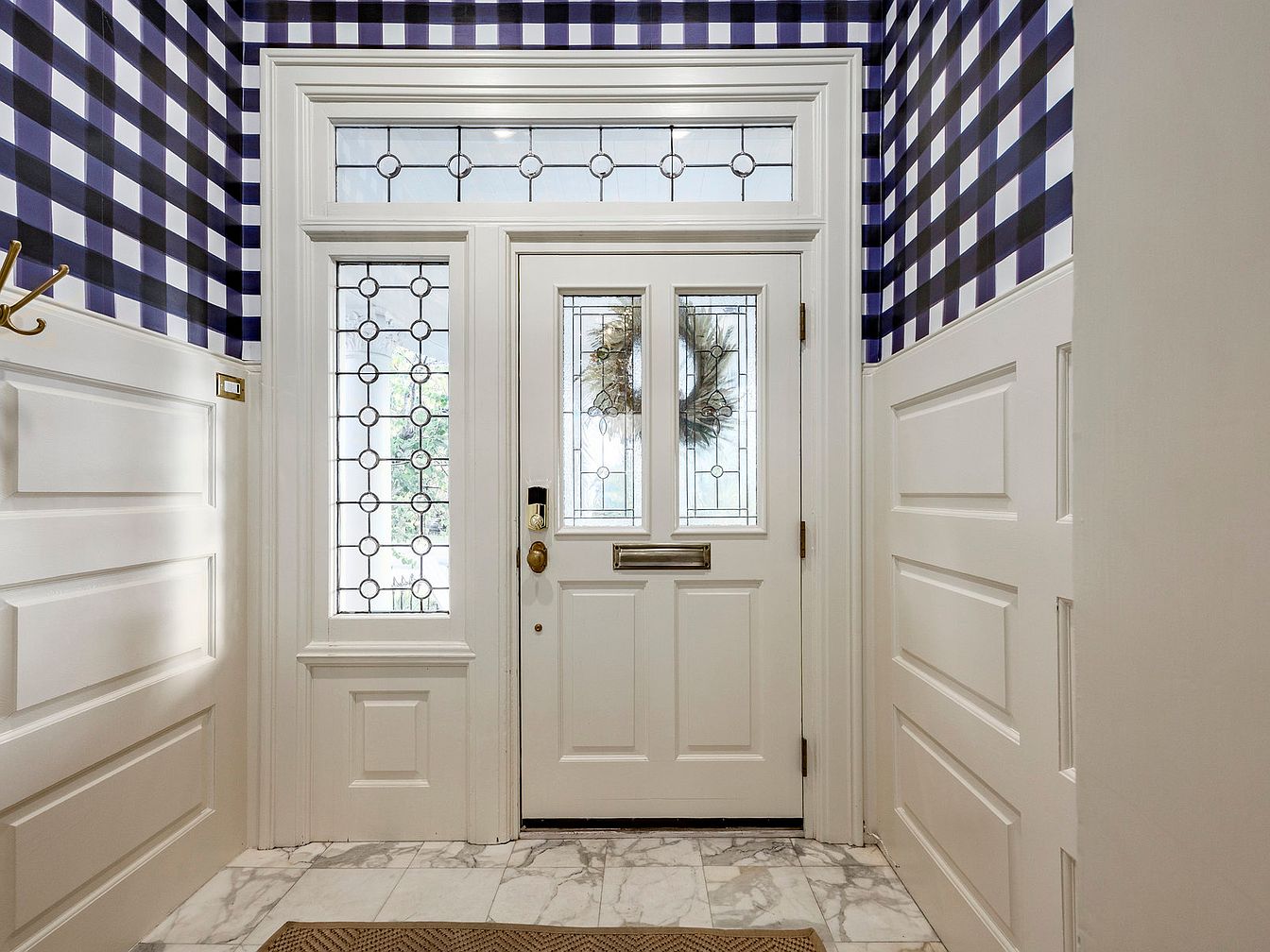 This charming entryway boasts an inviting atmosphere, highlighted by a stunning combination of classic and contemporary design elements. The patterned navy and white wallpaper creates a striking visual impact, while the elegant glass-paneled front door lets in natural light, enhancing the spacious feel. Marble flooring adds a touch of sophistication, complemented by a warm, textured doormat. The wainscoted walls evoke a sense of tradition, providing a durable yet stylish backdrop. Functional features include a stylish coat hook, perfect for family convenience, making this space not just beautiful but also practical for everyday living.