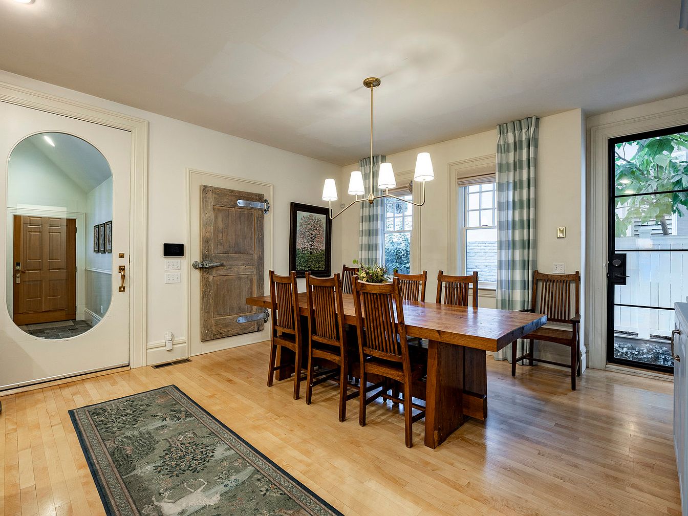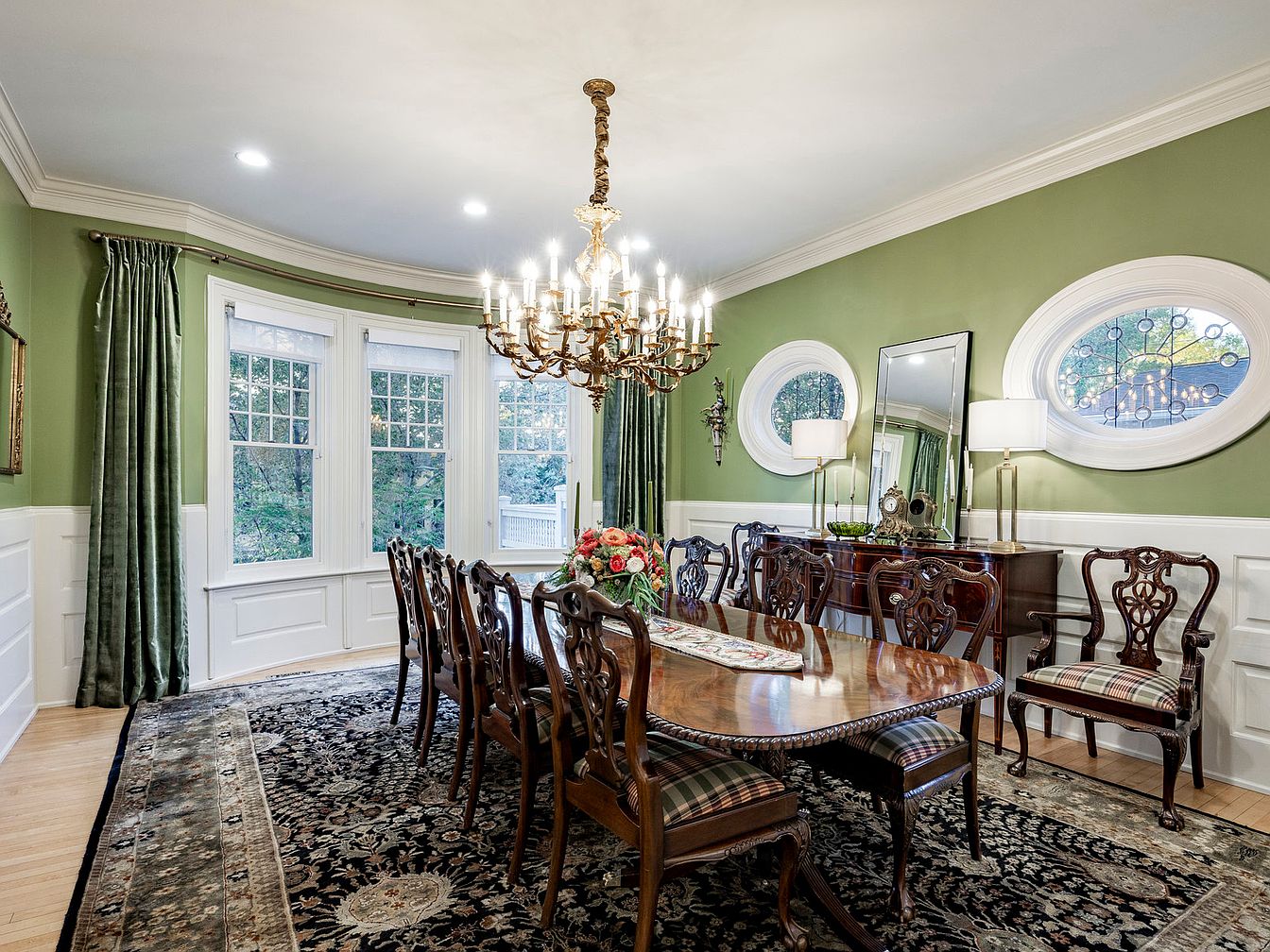 This elegant dining room combines classic charm with inviting comfort, featuring a richly detailed wooden table surrounded by ornate chairs with plaid upholstery. The warm green walls create a cozy atmosphere while offering a fresh, inviting backdrop. A stunning chandelier hangs from the ceiling, casting a soft glow over the space, complemented by strategically placed wall sconces. An intricately patterned area rug warms the hardwood floor, grounding the room’s aesthetic. Large windows framed by lush curtains allow natural light to pour in, highlighting the artwork and architectural details, making it a perfect space for family gatherings and celebrations.