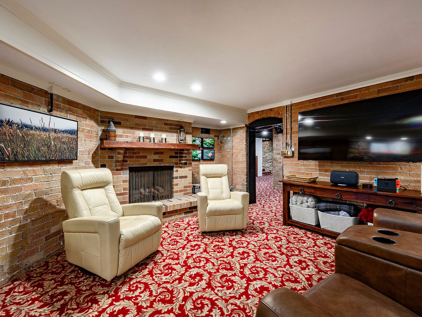 A welcoming family den designed for relaxation and entertainment, featuring a striking combination of exposed brick walls and rich red patterned carpet. Comfortable, plush recliners offer a cozy seating option, perfectly positioned around a charming fireplace that serves as a central focal point. The dark wood entertainment console harmonizes with modern technology like a large flat-screen TV and gaming station, making it ideal for family gatherings. Warm lighting highlights the space, while decorative artwork provides a personal touch, creating an inviting atmosphere perfect for both intimate family evenings and lively game nights.