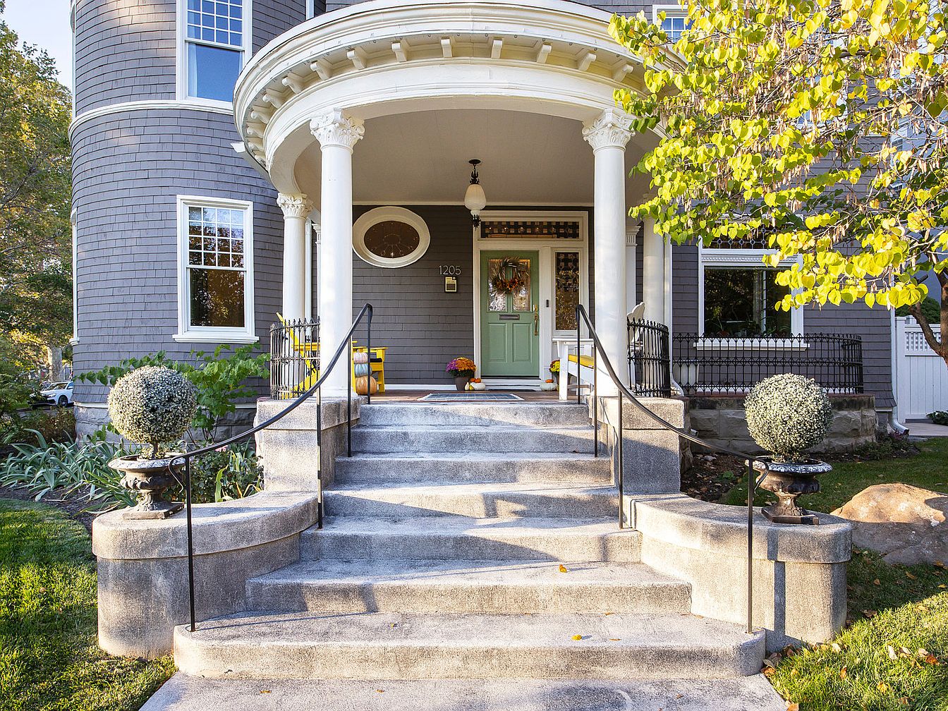 This inviting entrance is marked by a gracefully curved stone staircase leading to a classic porch adorned with white columns. The soft sage green door contrasts beautifully with the deep gray shingle siding, adding a touch of modern flair to the traditional design. Flanking the steps, manicured topiary bushes in ornate pots provide a refined touch, while lush greenery enhances the welcoming atmosphere. Architectural details, such as the round window and elegant porch ceiling, reflect a blend of sophistication and warmth, making this space perfect for family gatherings and friendly interactions, inviting visitors to step inside.