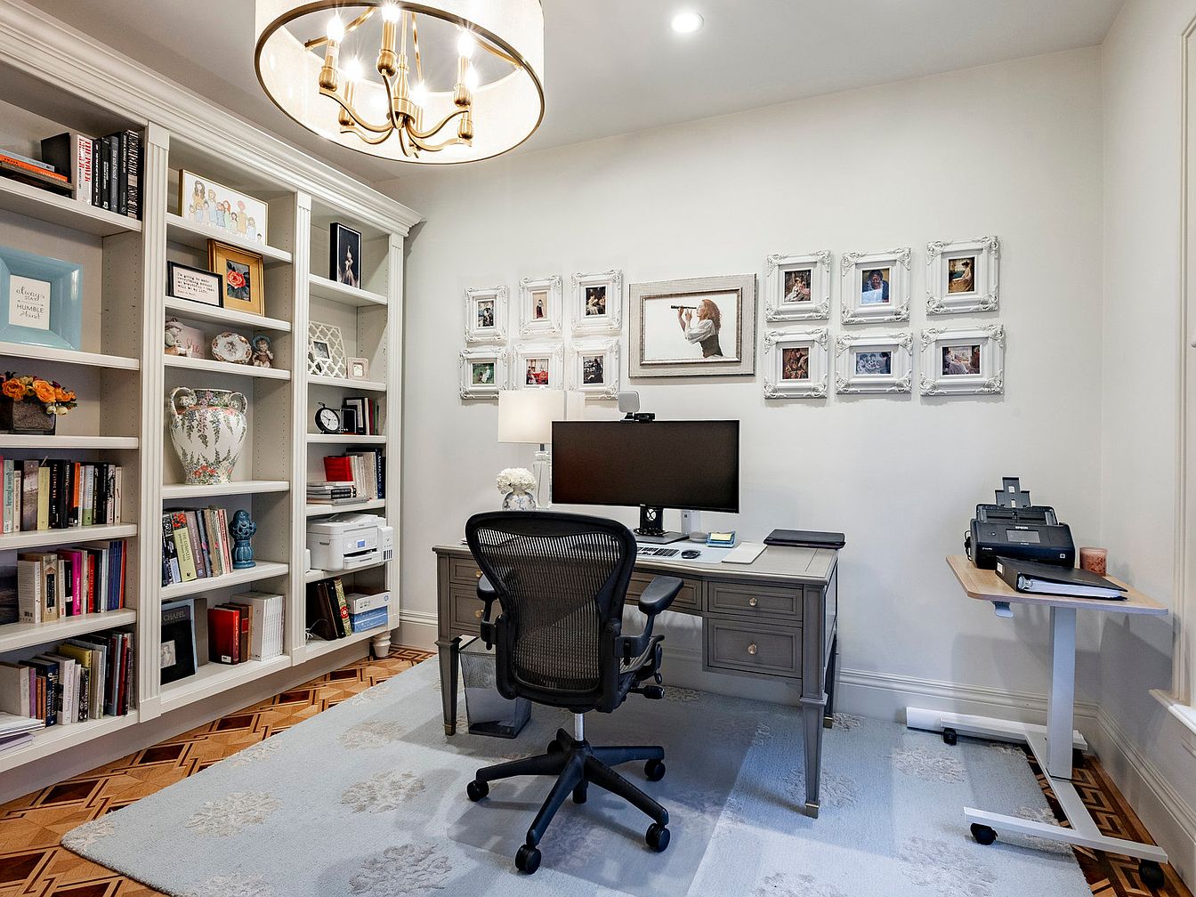 This inviting home office blends functionality and style, featuring a spacious layout surrounded by built-in bookshelves brimming with literature and decorative pieces. The neutral color palette is enriched by a soft area rug, creating a warm and welcoming atmosphere. A sleek desk, paired with an ergonomic chair, offers a comfortable workspace, while a large monitor ensures productivity. A decorative gallery wall adorned with framed photos adds a personal touch, making this space feel unique and homely. Convenient features include a mobile printer station and ample storage, making it perfect for family use or remote work.