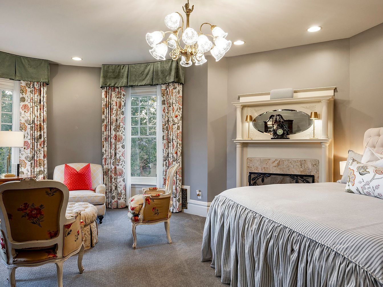 A cozy master bedroom features elegant furnishings and warm color palettes that invite relaxation. The prominent bed, adorned with a striped ruffled skirt and plush pillows, exudes comfort. Flanking the room are large windows dressed with floral-patterned drapes, allowing natural light to stream in and accentuate the soft gray walls. A stunning chandelier illuminates the space while adding refined charm. Sitting areas enhance family bonding, with lovely upholstered chairs and a small ottoman creating an inviting nook for reading or conversation. The decorative fireplace, highlighted by a vintage clock, adds a touch of sophistication, making it a perfect retreat.