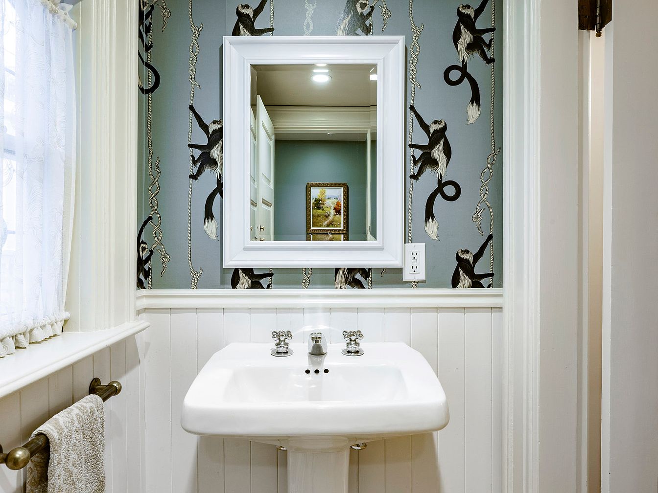 This charming bathroom features playful monkey-patterned wallpaper that adds a whimsical touch to the space. The elegant white pedestal sink complements the wainscoted lower wall, creating a classic look. A large, framed mirror reflects light, enhancing the room’s brightness and openness. Soft natural light filters through the sheer drapes, contributing to a warm, inviting atmosphere. The subtle blue tone in the wallpaper provides a calming backdrop, creating a serene environment perfect for relaxing moments. Family-friendly touches, such as the plush towel rack and easy accessibility, make this a practical yet stylish retreat for any home.