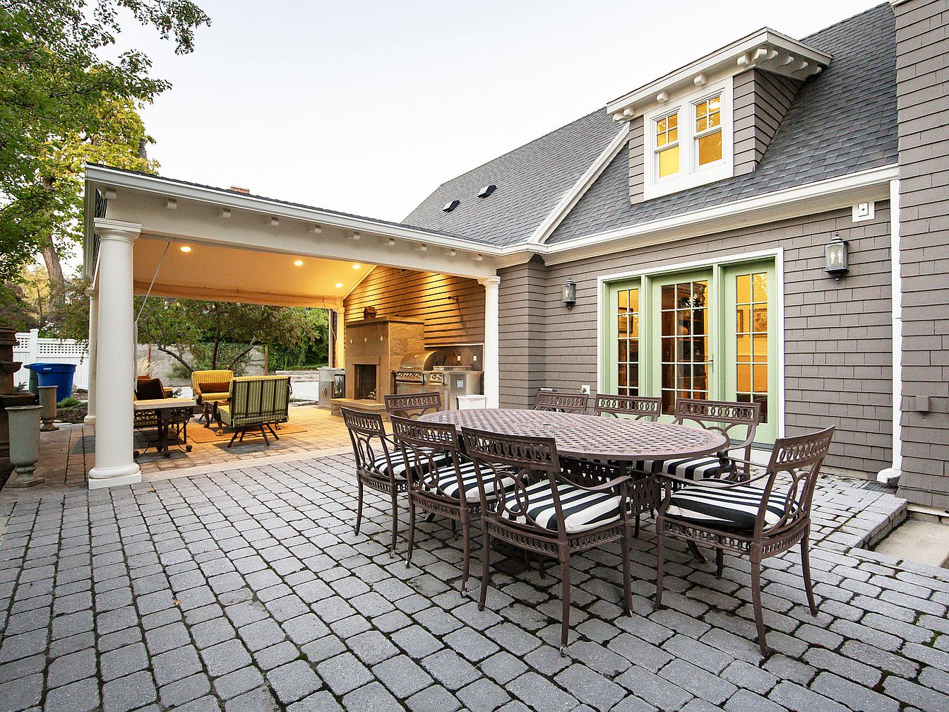 This inviting outdoor dining area is designed for family gatherings and entertaining. The spacious patio features elegant stone pavers, complemented by a sturdy wrought iron dining table surrounded by matching chairs, adorned with stylish striped cushions. A cozy seating nook under a covered patio provides a perfect spot for relaxation, framed by tasteful pendant lighting. The house’s exterior boasts a rich gray siding that contrasts beautifully with vibrant green shutters and warm yellow window panes. A built-in grill and outdoor fireplace enhance functionality, making this space ideal for cooking and enjoying meals amidst a serene outdoor backdrop.