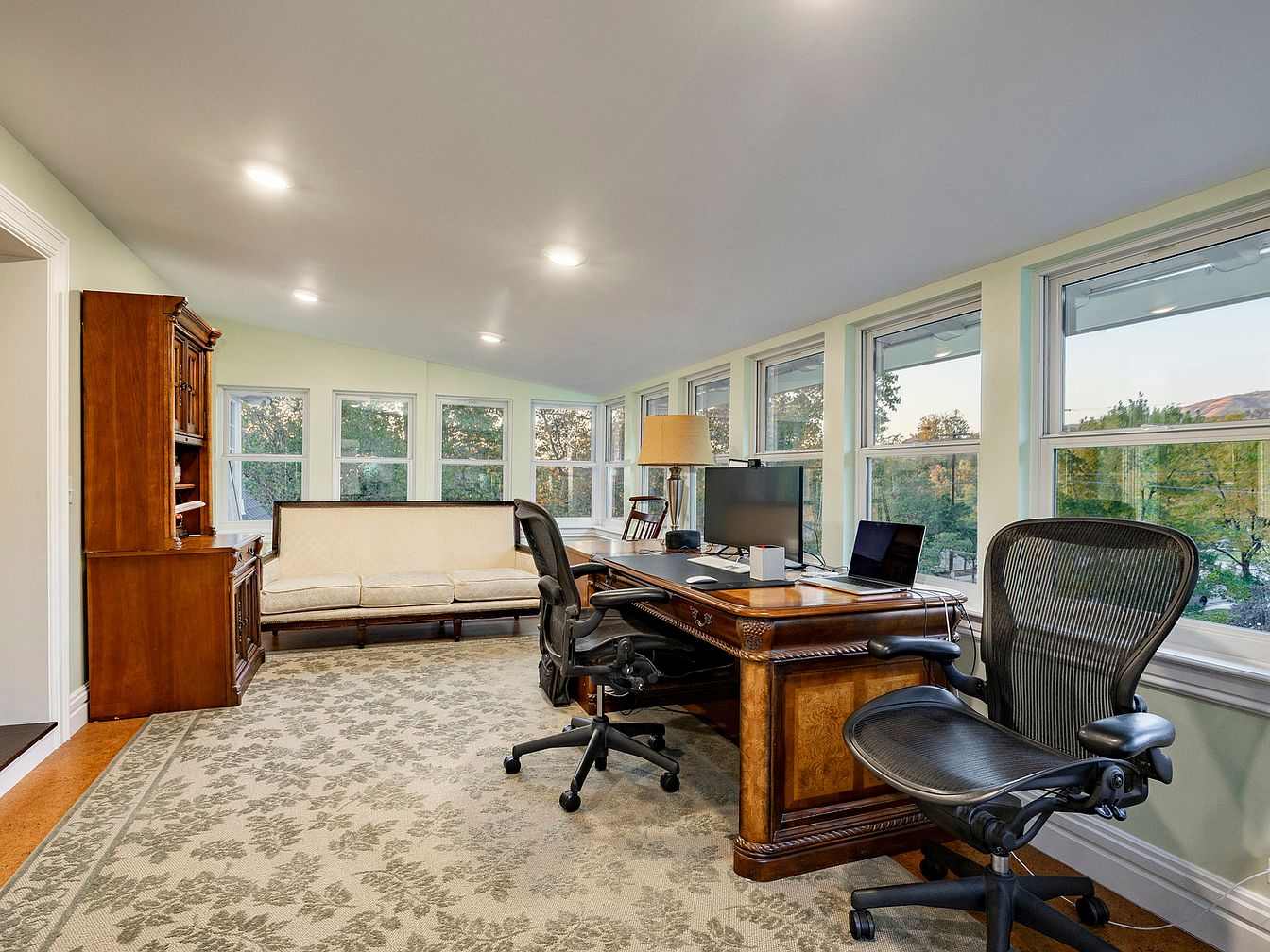 This bright home office epitomizes a perfect balance of functionality and comfort. Bathed in natural light from expansive windows, the room features a harmonious color scheme of soft greens and neutrals, enhancing the serene ambiance. A sturdy wooden desk, accented with intricate detailing, serves as the centerpiece, complemented by ergonomic office chairs for productivity. Adjacent to the desk is a stylish, upholstered couch, ideal for relaxation or informal meetings. Rich carpets add warmth underfoot, while built-in shelving offers practical storage solutions. This space punctuates a family-friendly design, making it an inviting area for work and creativity.