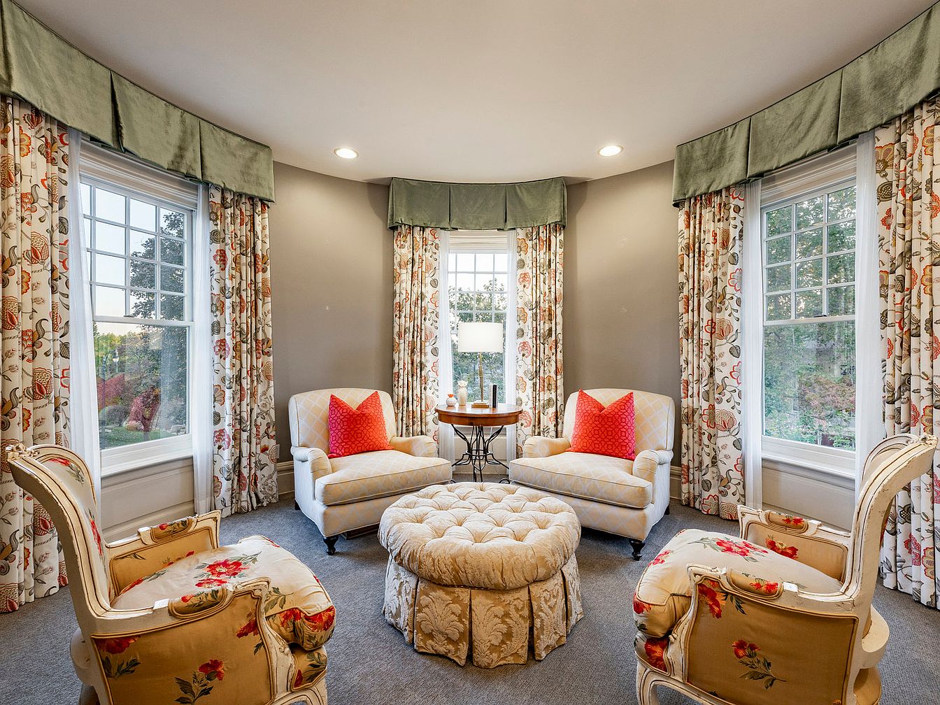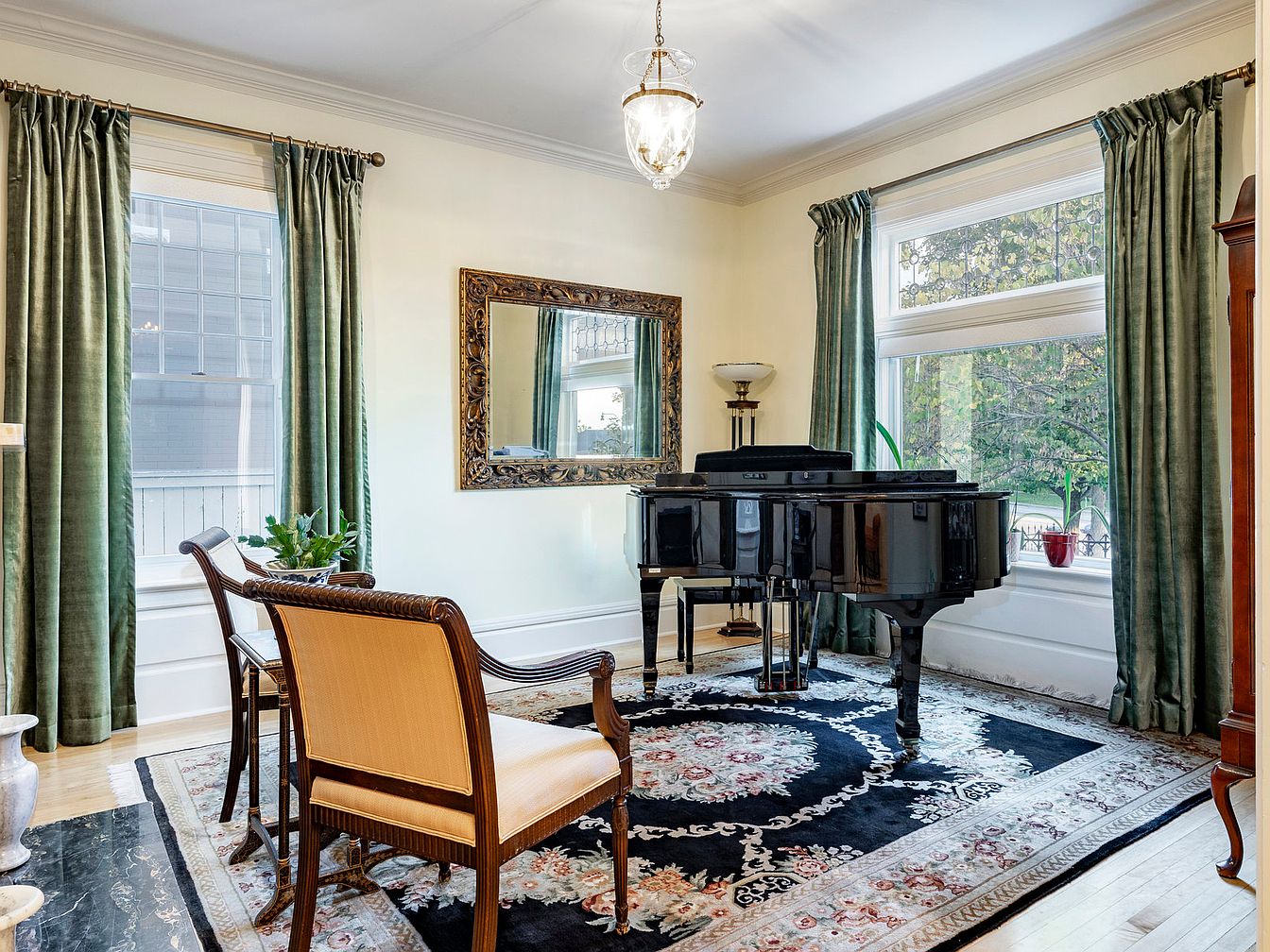 This elegantly designed music room combines comfort and sophistication, showcasing a grand piano as its centerpiece. Soft light filters through large windows, accented by rich, green velvet drapes that create a serene ambiance. The warm wood tones of vintage chairs complement the ornate rug, which features intricate floral patterns, enhancing the classic feel. The space is thoughtfully arranged for both musical enjoyment and intimate gatherings, featuring a plush seating area ideal for family and friends. A decorative mirror and vintage lamp add charm, while the natural light brightens the creamy walls, making this a welcoming retreat.