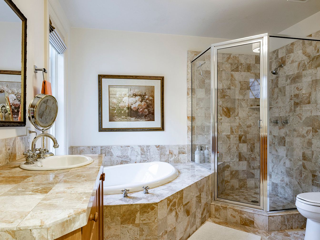 This bathroom blends luxury and functionality in a serene space designed for relaxation. The layout features a spacious marble countertop paired with a vintage-inspired basin, showcasing classic craftsmanship. A luxurious soaking tub is set against a backdrop of warm, natural stone tiles, creating a spa-like atmosphere. The glass-enclosed shower offers modern convenience, while sleek fixtures add a touch of elegance. Muted earth tones dominate the color scheme, harmonizing with an inviting floral artwork that enhances the aesthetic appeal. Ample natural light filters through a window, making this inviting retreat perfect for family use and unwinding after a long day.