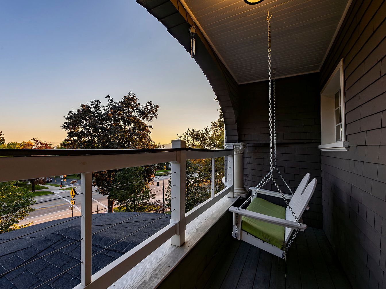 The balcony features a charming swing chair, perfect for leisurely afternoons. With a soothing color palette of muted grays and crisp whites, the area feels both inviting and tranquil. Architectural details like the elegant columns and arched ceiling add character, while the view of the surrounding trees brings nature into the space. The floor is crafted with planks, giving it a rustic touch, while a soft green cushion on the swing offers comfort. This outdoor retreat is ideal for families, providing a safe haven for relaxation and connection with the outdoors.