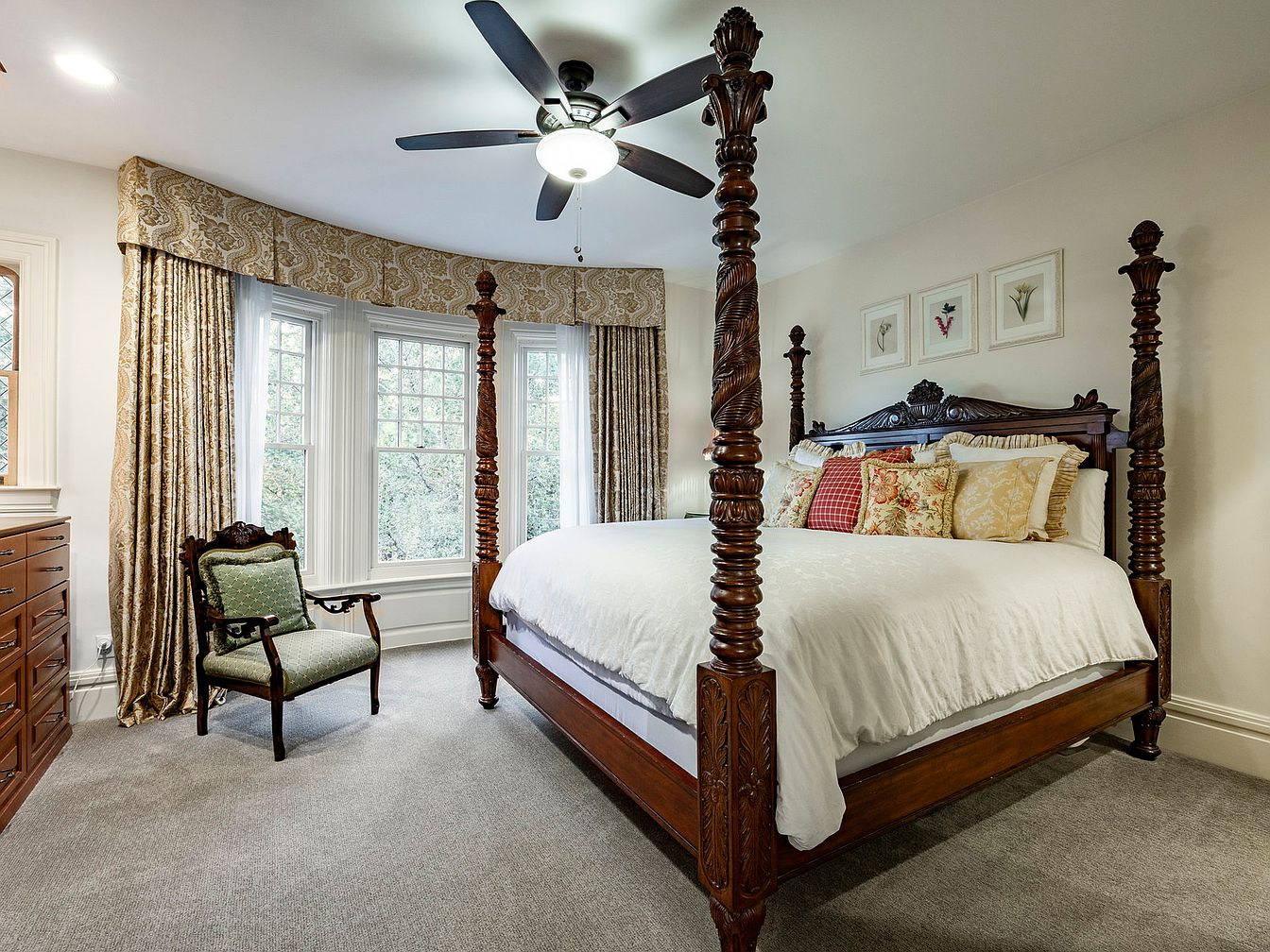 This master bedroom exudes elegance with its stunning four-poster bed, featuring intricately carved wooden posts that provide a regal touch. The spacious layout showcases plush carpeting and large bay windows adorned with luxurious drapes, inviting natural light and offering picturesque views. A comfortable armchair in a muted green hue complements the room’s soft, neutral color palette, promoting relaxation. Decorative pillows in warm tones and floral patterns add a cozy feel to the bed. Architectural details, such as crown molding and tasteful artwork, enhance the room’s charm, creating a serene space ideal for unwinding or enjoying intimate family moments.