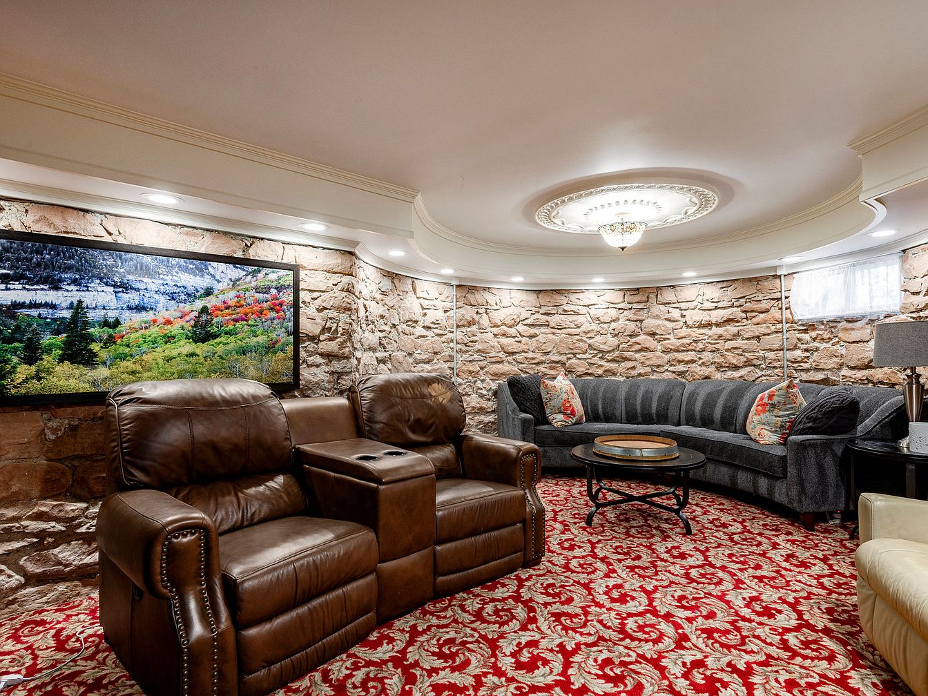 This inviting family room features a stunning blend of rustic charm and modern comfort. The stone wall provides a warm backdrop, enhancing the room’s cozy atmosphere while the ornate ceiling adds an elegant touch. Plush, dual reclining leather chairs and a comfortable sectional invite relaxation, adorned with vibrant cushions that echo the colors of the framed landscape artwork. A circular wooden coffee table complements the intricate, patterned carpet, creating a harmonious color scheme of earth tones and rich reds. Soft lighting from recessed fixtures subtly illuminates the space, making it perfect for gatherings or quiet evenings with family.