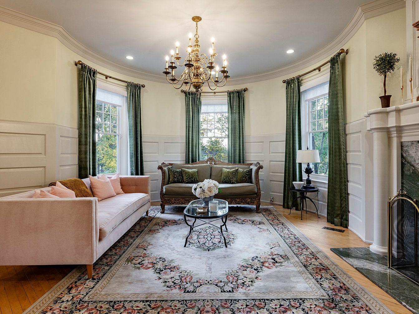 This charming living room features a classic curved layout, highlighted by a soft blush velvet sofa adorned with pastel pillows, inviting relaxation. A beautifully detailed vintage loveseat adds a touch of sophistication, while the striking chandelier provides an elegant focal point. Rich emerald drapes frame the windows, allowing natural light to dance on the polished wooden floor. The intricate area rug showcases floral patterns, enhancing the warm atmosphere. A marble fireplace, complemented by a stylish glass table, adds both comfort and style. This space effortlessly merges traditional aesthetics with family-friendly elements, making it perfect for gatherings.