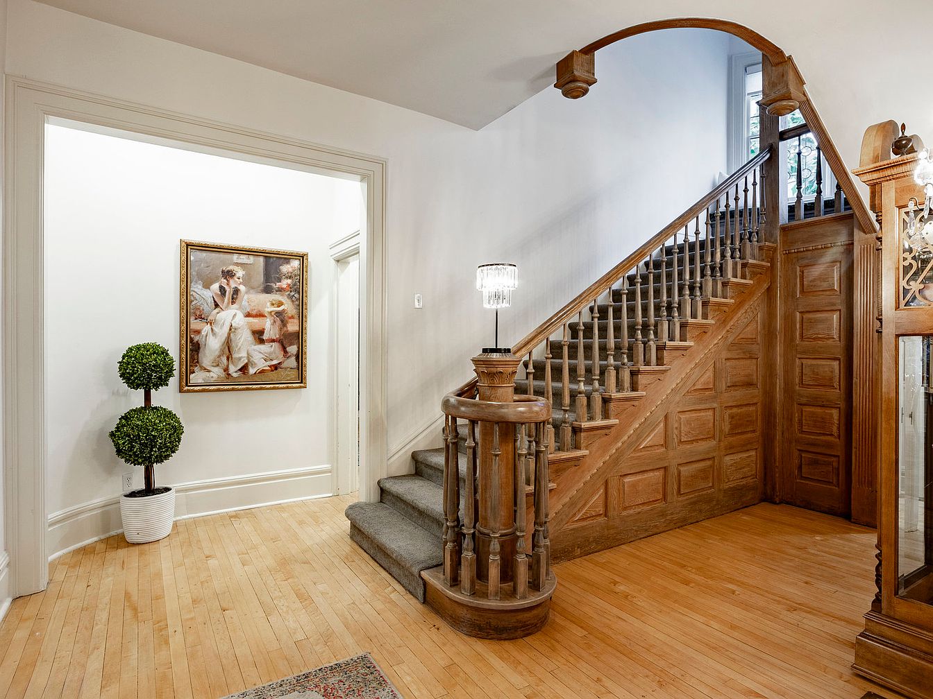 A charming entryway welcomes visitors with a classic wooden staircase, its intricate banister showcasing elegant craftsmanship. The warm, honey-toned wooden flooring runs throughout the space, enhancing the inviting ambiance. A well-placed potted topiary adds a touch of greenery, while ornate artwork on the wall enhances the aesthetic appeal. This area is designed to flow seamlessly into the rest of the home, promoting a family-friendly atmosphere. The combination of soft, neutral wall colors and well-lit spaces ensures a bright, airy feeling, making it ideal for gathering and transition into everyday life.