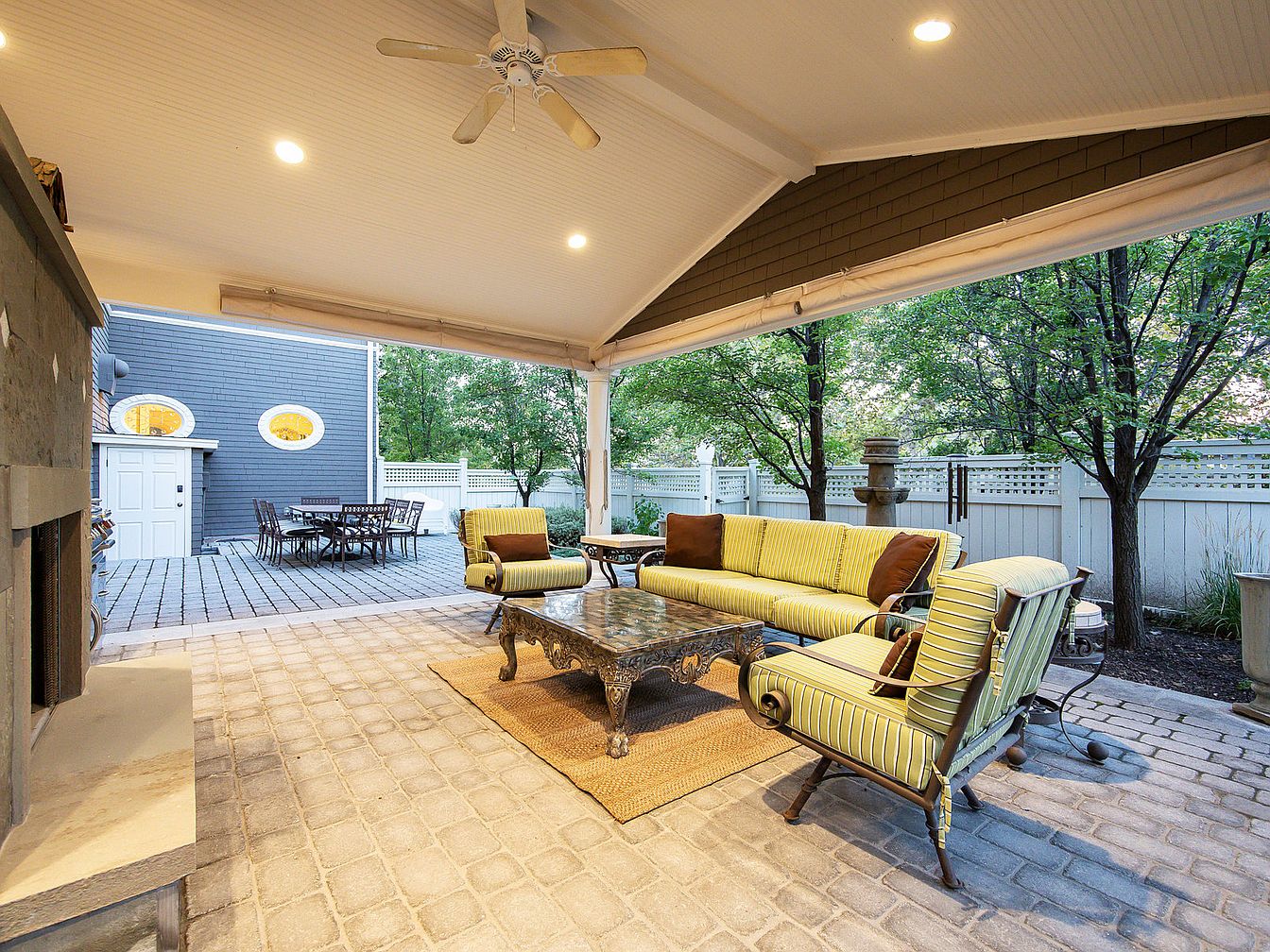 This inviting outdoor living area features a spacious layout, perfect for both relaxation and entertainment. A cozy sectional sofa with vibrant yellow and brown striped cushions invites gatherings, while a charming glass-top coffee table enhances the aesthetic. The rustic stone fireplace adds warmth to cooler evenings, complemented by soft recessed lighting in the ceiling. A dining set nearby overlooks a well-maintained patio, surrounded by lush greenery and a privacy fence. The textured stone flooring adds a rustic touch, harmonizing with the home’s natural ambiance, making it an ideal family-friendly space for outdoor enjoyment.