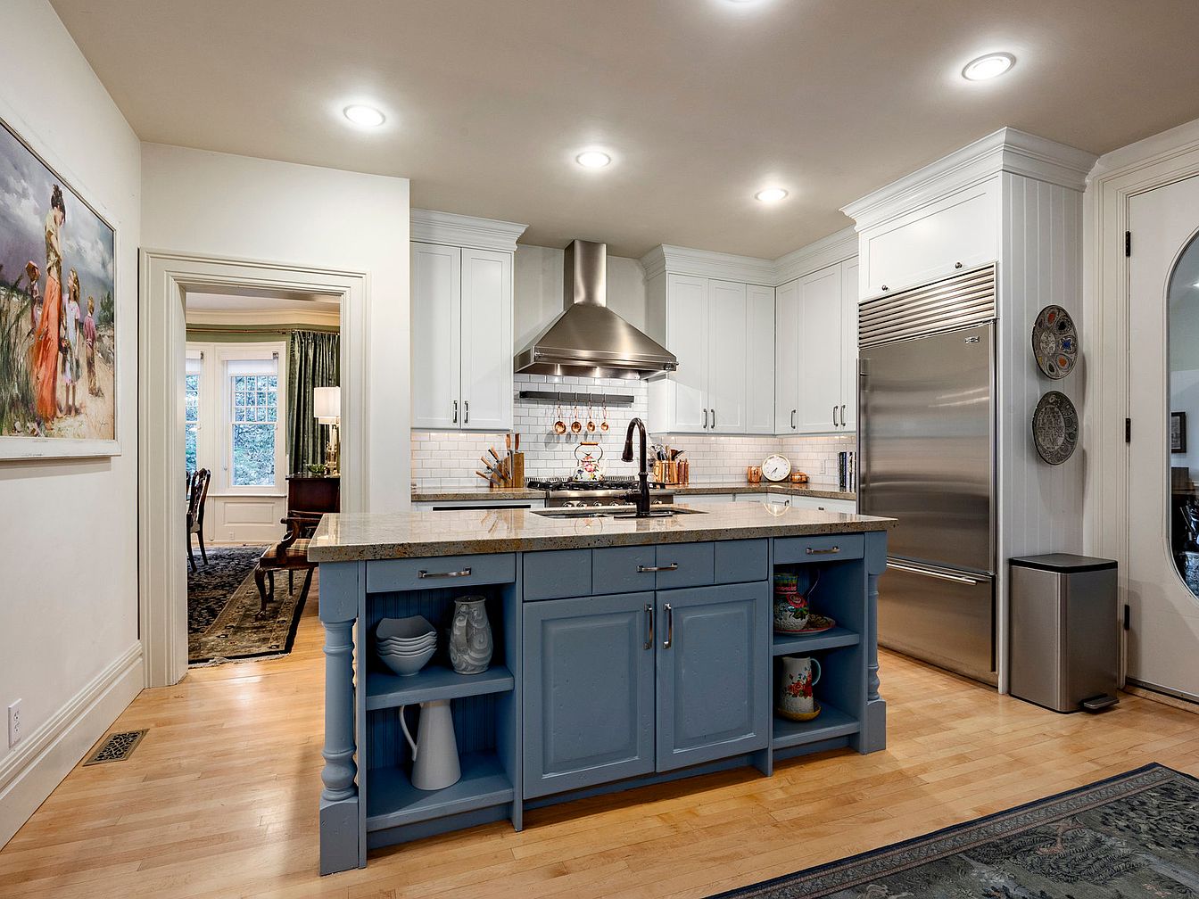 This inviting kitchen showcases a blend of modern convenience and timeless elegance. The standout feature is the centrally located island, painted a soft blue that complements the warm wooden flooring. Sleek granite countertops provide ample prep space while the stainless-steel appliances enhance a contemporary feel. Shaker-style cabinets with pristine white finishes add to the kitchen’s brightness and functionality. Subtle decorative touches, such as ceramic dish displays and artistic wall hangings, bring personality to the space. Large windows invite natural light, creating a family-friendly environment perfect for gatherings, cooking, and enjoying culinary adventures together.