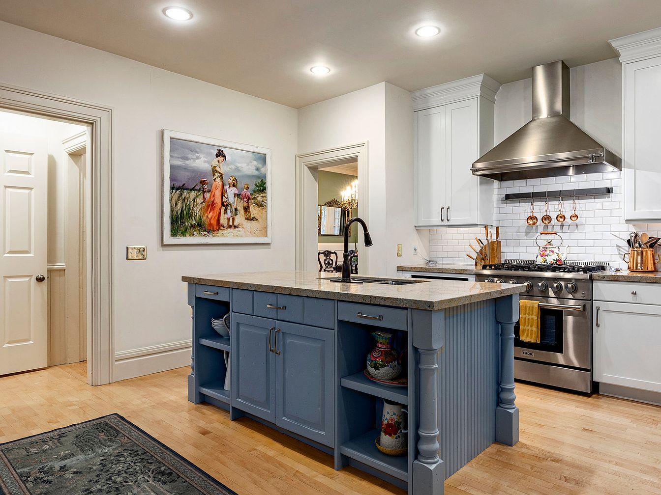 This spacious modern kitchen features a striking blue island with detailed paneling and open shelving, perfect for displaying stylish kitchenware. Elegant granite countertops complement the stainless steel appliances, creating a sleek, functional space for culinary endeavors. Understated white cabinetry tops the walls, harmonizing beautifully with the mosaic tile backsplash. A bright color palette exudes warmth, while recessed lighting enhances the inviting atmosphere. Family-friendly elements include ample storage and counter space, ensuring convenience during meal preparation. The artwork above the island adds a personal touch, blending artistic charm with the kitchen’s practical layout, making it an ideal gathering spot for loved ones.