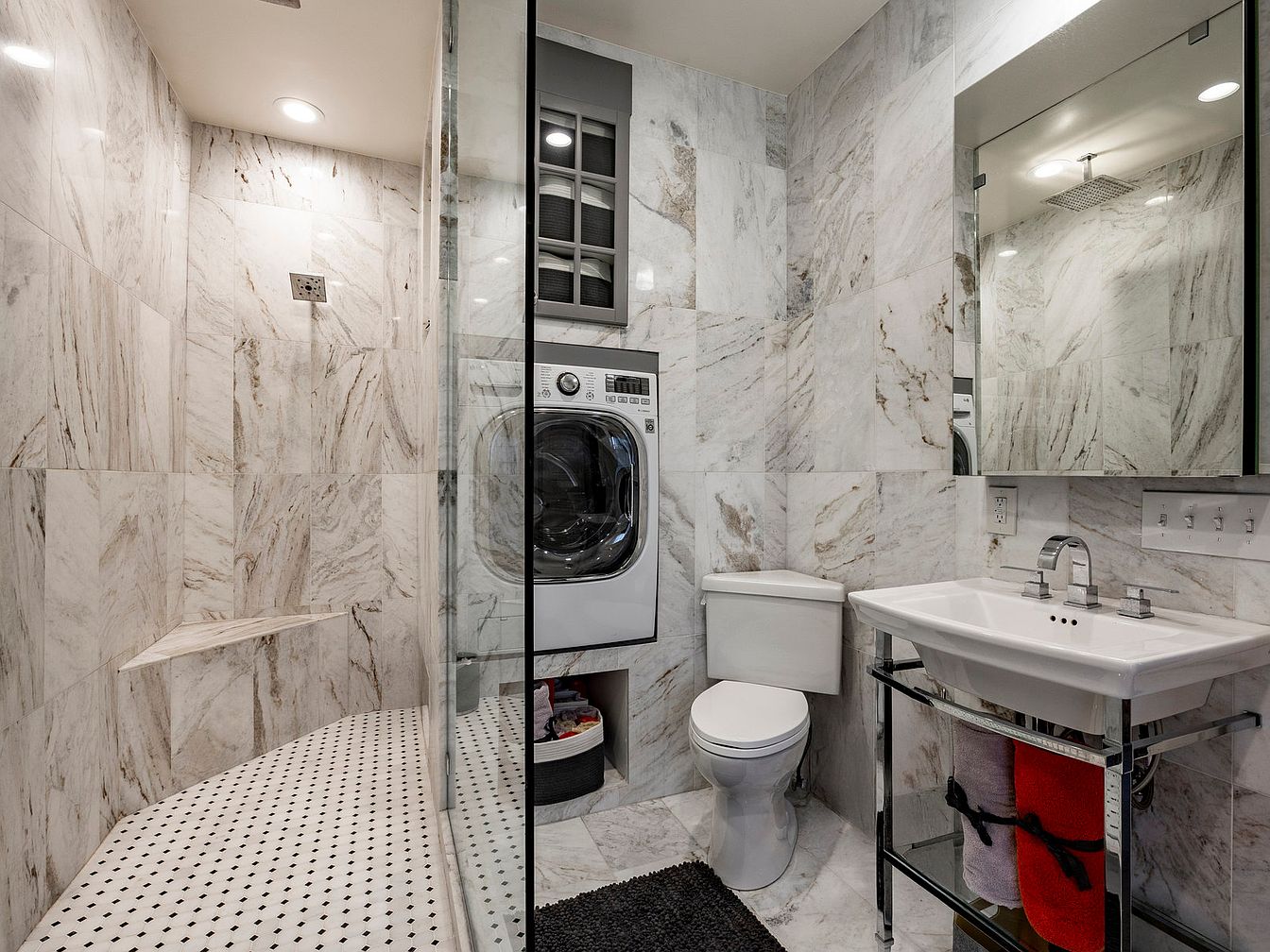 This elegant laundry bath combines functionality with sophisticated design. The space features sleek marble walls and a spacious glass shower, offering a clean, modern aesthetic. Located conveniently, the washer and dryer blend seamlessly into the decor, enhancing utility without sacrificing style. A striking contrast is created by the black and white tiled flooring, which adds a touch of classic elegance. The floating sink, with its chrome accents, provides a contemporary feel, while ample storage solutions ensure a clutter-free environment. Soft lighting and a large mirror further enhance the room’s spaciousness, making it a perfect blend of comfort and modern convenience.