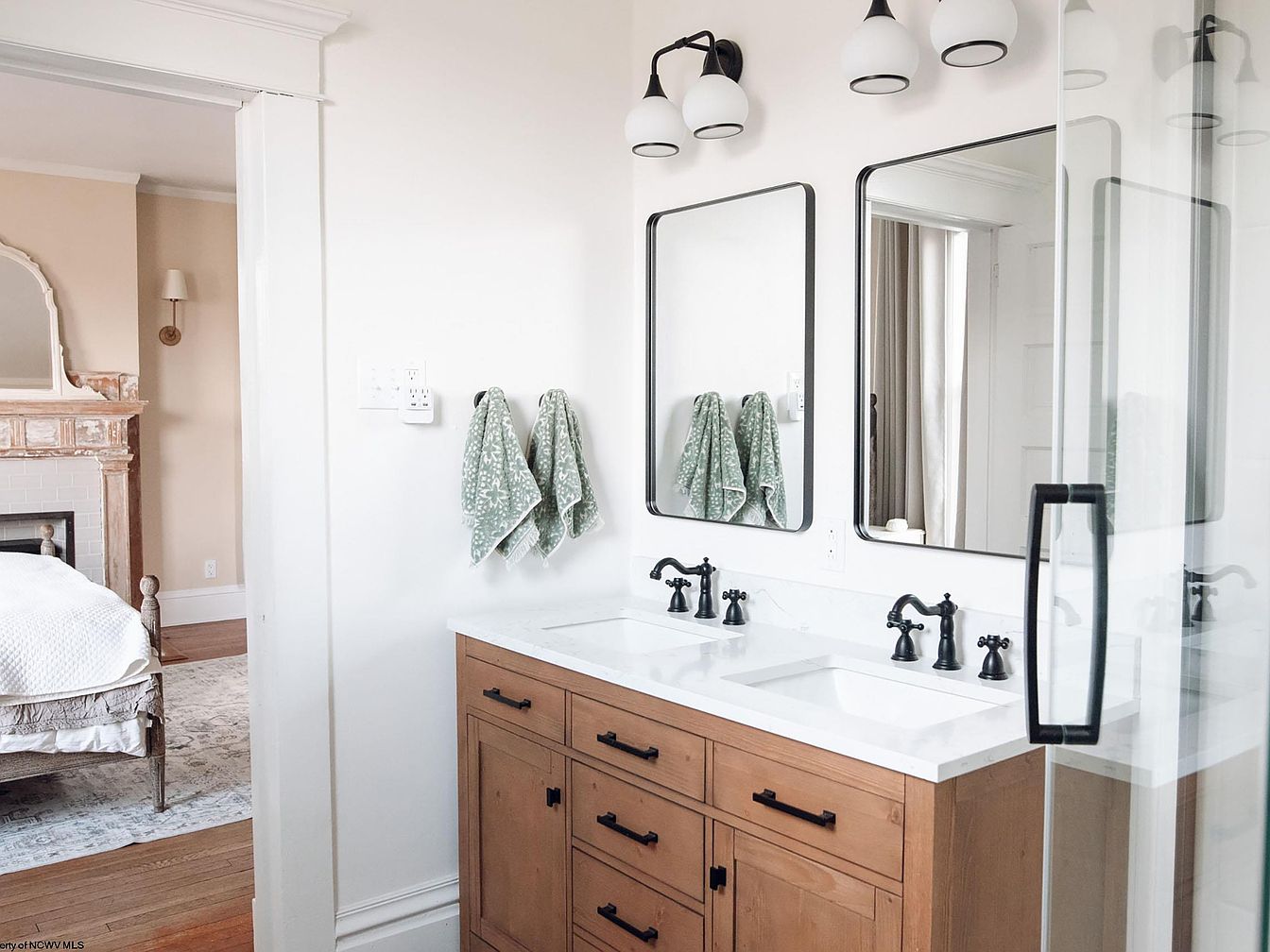 This master bathroom showcases a harmonious blend of modern elegance and rustic charm. Featuring a dual vanity with a sleek white marble countertop, the warm wood cabinetry adds an inviting touch. The black faucet fixtures contrast beautifully against the light walls, highlighting the meticulous design. Large, frameless mirrors enhance the space, creating an illusion of openness. Soft natural light filters in, complemented by chic wall sconces that provide a cozy ambiance. Practical elements, like strategically placed towel hooks and ample counter space, make it family-friendly, ensuring comfort and functionality in everyday routines.