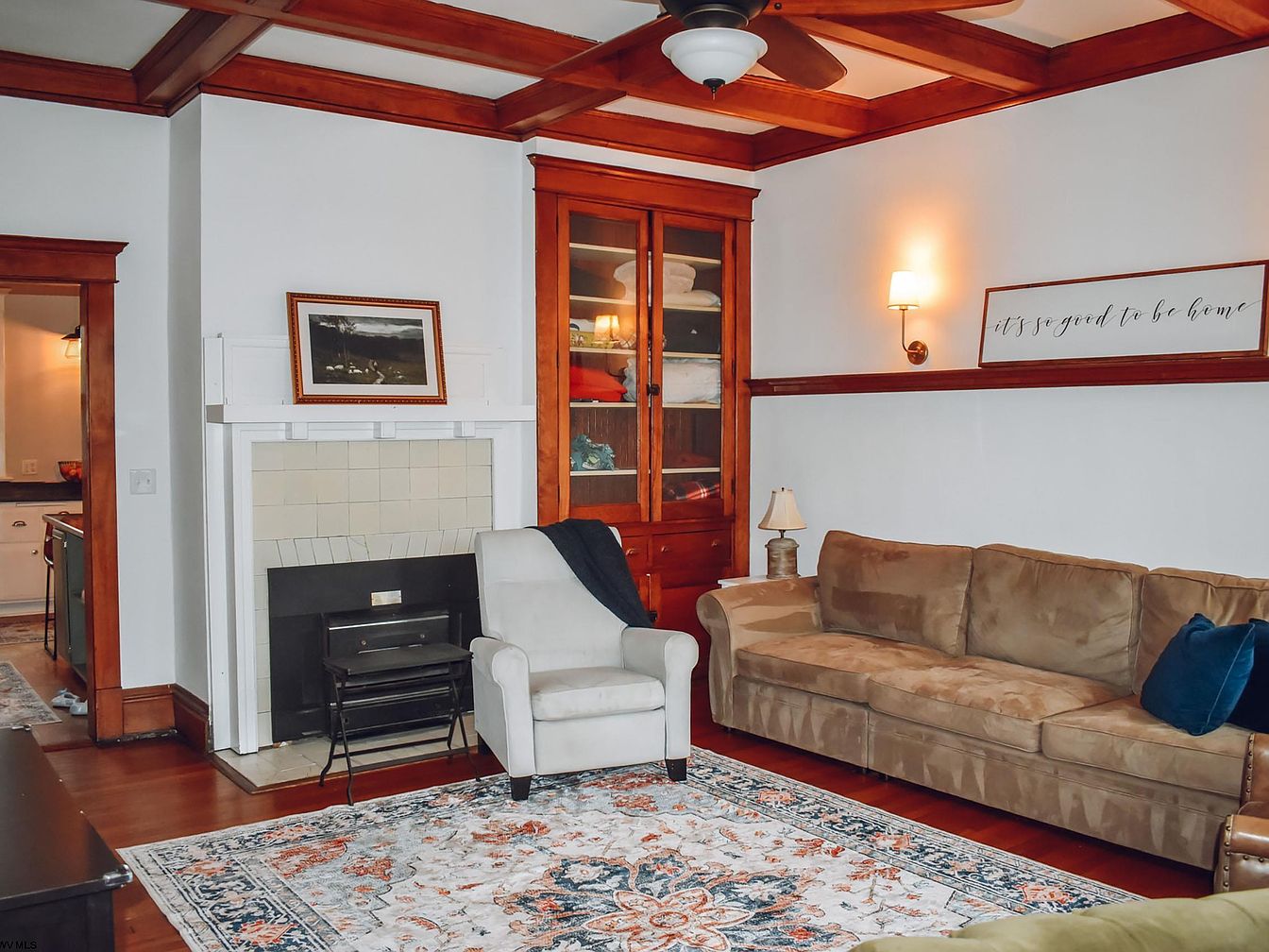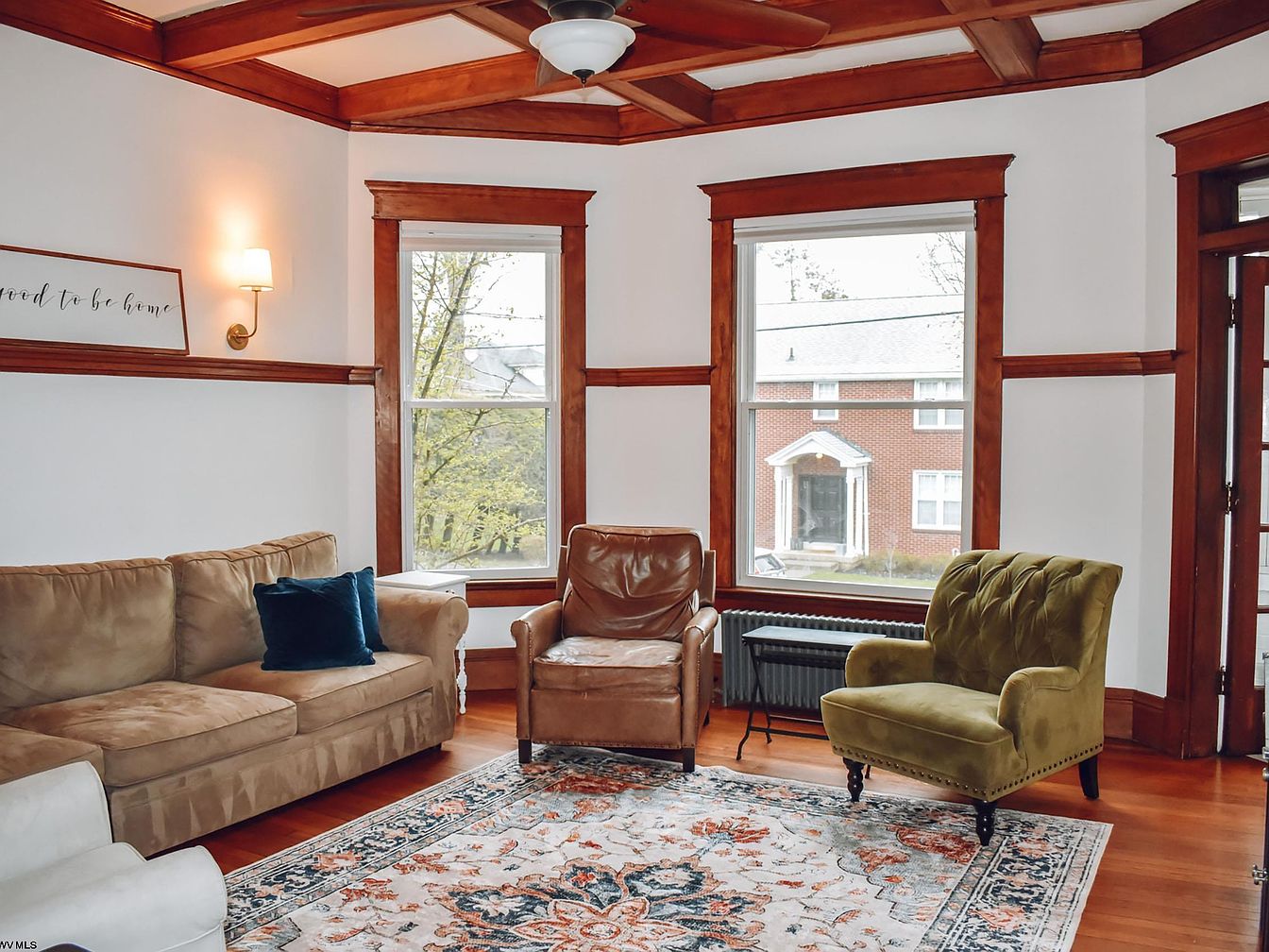 This inviting living room radiates warmth and charm, featuring a harmonious blend of textures and tones. The plush beige sofa, adorned with a contrasting deep blue pillow, offers comfort, while a vintage green armchair adds a pop of color. Rich wooden trim frames the large bay windows, flooding the space with natural light. The coffered ceiling enhances the room’s architectural interest, complemented by ambient lighting for a cozy atmosphere. A beautifully patterned area rug anchors the seating area, creating a family-friendly space ideal for relaxation. Overall, this room captures a perfect blend of elegance and coziness.