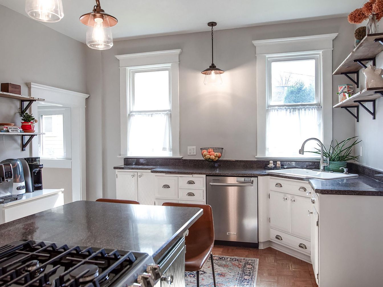 This modern kitchen features a blend of contemporary and classic elements, making it a family-friendly space. The layout includes a central island that serves as both a prep area and a casual dining spot, with stylish bar stools adding comfort. Gorgeous gray walls complement the rich wood cabinetry, while bright white countertops ensure a clean, airy feel. Natural light floods the room through large windows, softened by delicate curtains. A mix of open shelving allows for decorative displays and easy access to essentials, showcasing thoughtful design that balances functionality and aesthetic appeal.