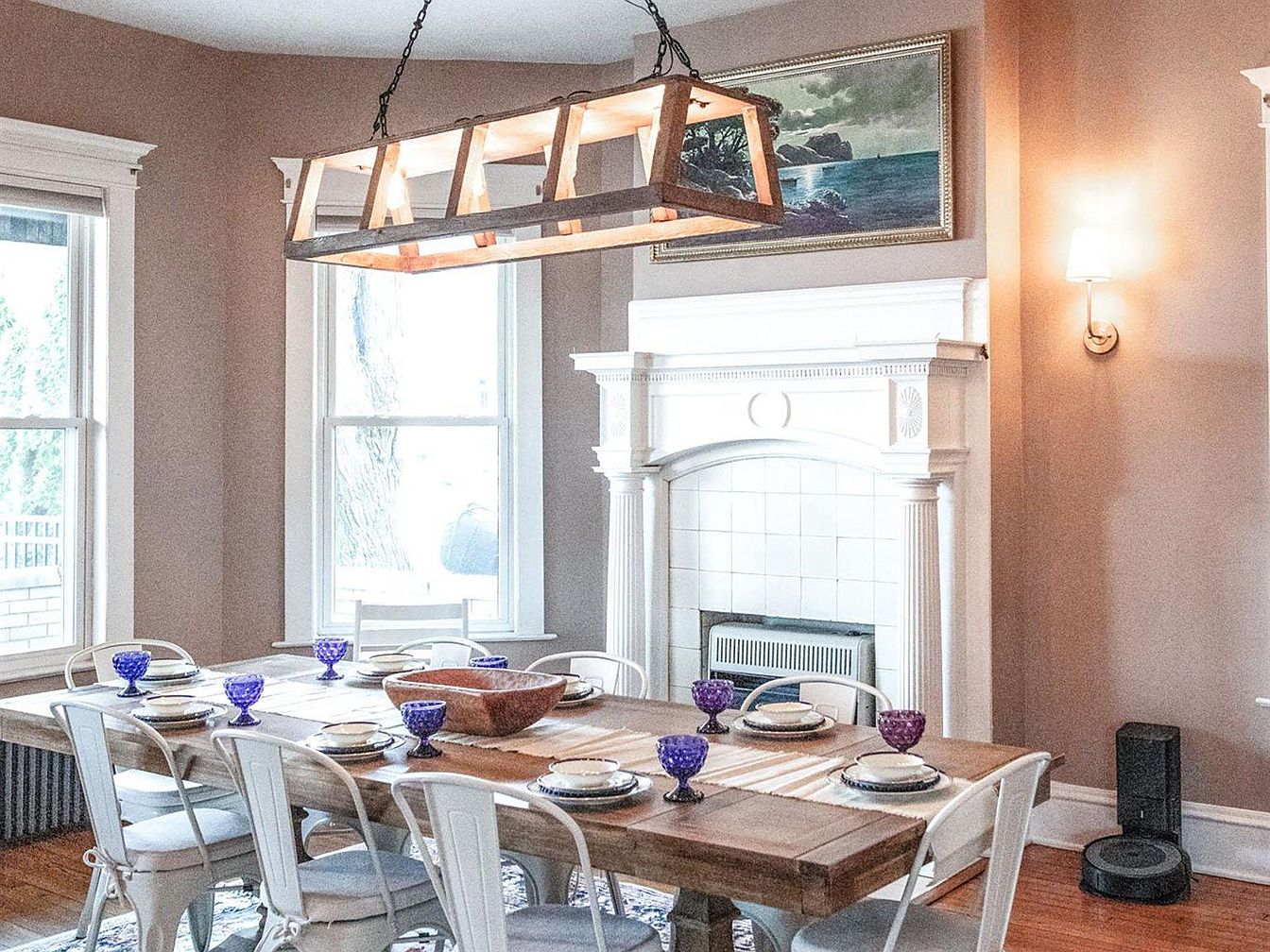 This dining room showcases a blend of traditional and modern design elements, creating an inviting atmosphere perfect for family gatherings. A large wooden table, set with classic dishware and striking blue glass goblets, takes center stage. Above, a stylish wooden chandelier adds rustic charm, while ample natural light streams through large windows, enhancing the warm beige walls. Architectural details, such as the decorative fireplace and elegant wall sconces, add sophistication. The combination of comfortable white metal chairs and the rich wooden table encourages casual dining, making this space ideal for both entertaining and everyday meals.