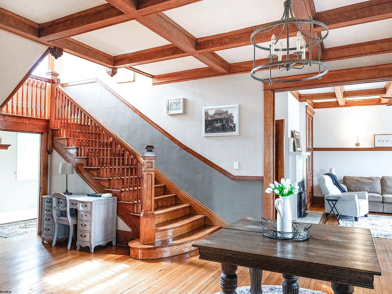 Upon entering this charming American home, the inviting entryway showcases a stunning wooden staircase with elegant banisters, leading to the upper levels. The coffered ceiling adds architectural interest while bathed in natural light from surrounding windows. A cozy nook with a stylish desk subtly integrates function and beauty, offering a perfect spot for everyday tasks. The warm color scheme of earthy tones and rich mahogany harmonizes with the hardwood flooring, enhancing the home’s inviting ambiance. A modern light fixture elegantly contrasts the traditional elements, creating a harmonious blend of classic and contemporary design for a welcoming family-friendly space.