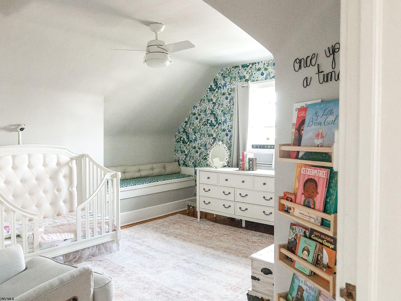 This charming kid’s bedroom features a serene layout perfect for relaxation and play. A soft color scheme of gentle whites and pastel accents creates a calming atmosphere. The focal point is a beautifully designed crib with tufted detailing, complemented by a cozy reading nook adorned with floral wallpaper, bringing a touch of nature indoors. Ample storage is offered through a stylish dresser and a book display that encourages reading. Natural light filters through the window, enhancing the inviting ambiance. Thoughtfully chosen furniture and decor make this space not only functional but also enchanting for young imaginations.