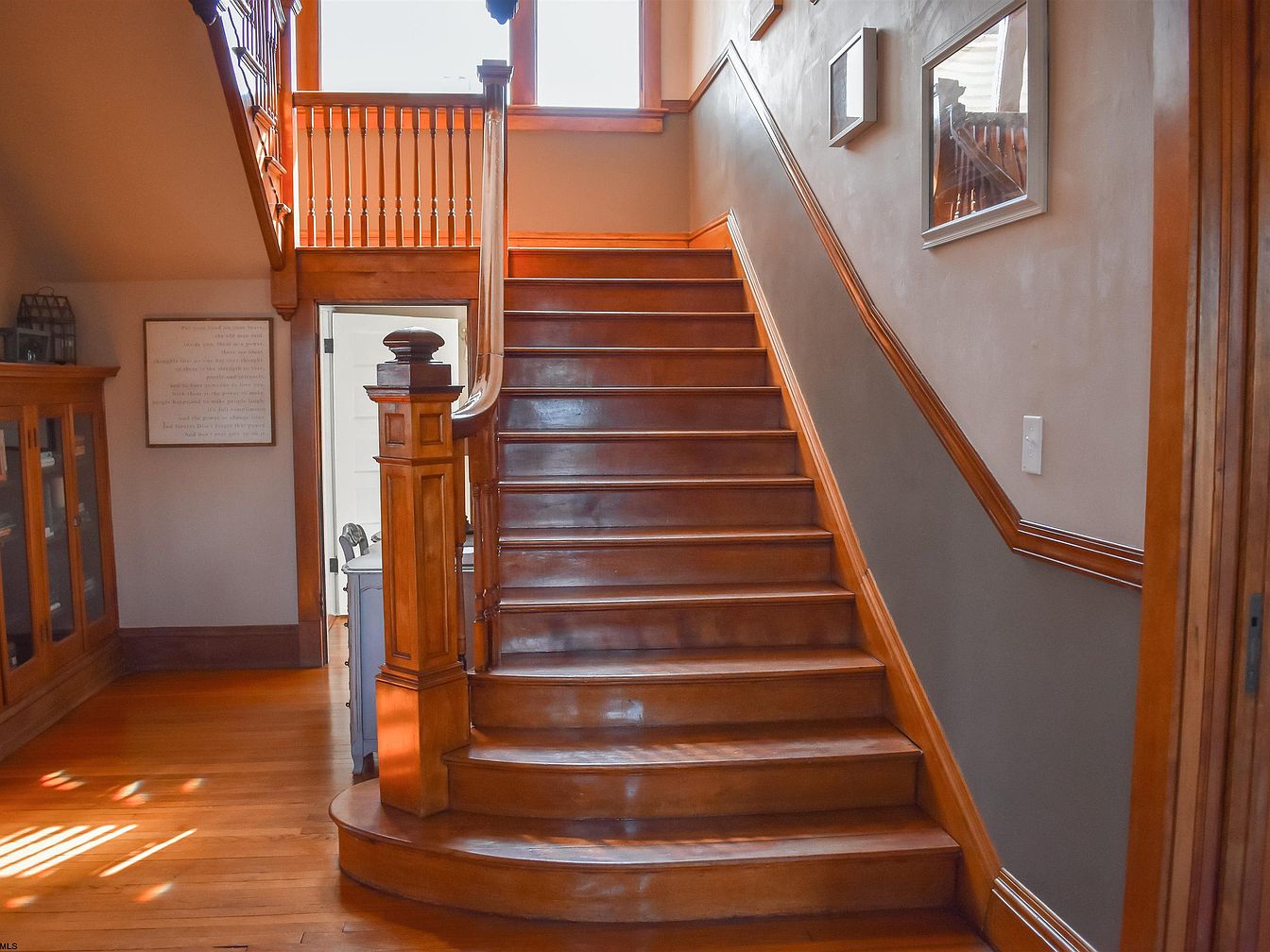 The staircase features rich, polished wooden steps that elegantly lead to the upper level, showcasing intricate balusters and a classic handrail. Soft, warm-toned walls provide a neutral backdrop that complements the wood’s natural beauty. Framed artwork enhances the space, bringing a personal touch and visual interest. Ample natural light floods in from nearby windows, illuminating the rich textures of the polished wood and creating a welcoming atmosphere. This family-friendly entryway promotes safety with sturdy railings and a spacious layout, allowing easy movement. The overall aesthetic combines elegance with comfort, perfect for both everyday use and special occasions.