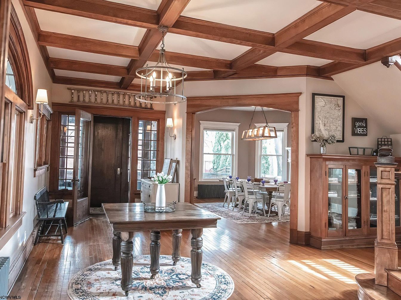 Welcoming and airy, the entrance hallway showcases a harmonious blend of classic and modern aesthetics. Beautiful coffered wooden ceilings add character, while ample natural light streams through large windows, creating a bright atmosphere. Rich hardwood floors lead the way toward a spacious dining area. The strategic placement of wall sconces enhances the warmth of the wooden accents, complemented by a round, decorative rug under the centerpiece table. Nearby, a charming sideboard features intricate detailing, accentuating family-friendly functionality. With a cohesive color palette of warm neutrals and deep wood tones, this space is perfect for both casual gatherings and elegant entertaining.