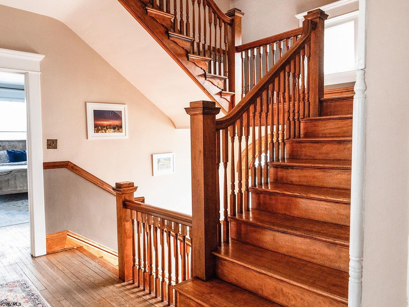 This elegant staircase serves as a striking focal point, featuring rich hardwood steps that lead gracefully to the upper level. The warm tones of the wood enhance the inviting atmosphere, complemented by textured walls in soft hues. Natural light floods the space through large windows, creating an airy feel. Architectural elements like the intricately designed banister and matching railing showcase craftsmanship, while framed art adds a personal touch to the decor. Family-friendly features include a spacious landing and ample room for decor or functional storage. This space blends tradition with warmth, offering a welcoming entrance to any home.