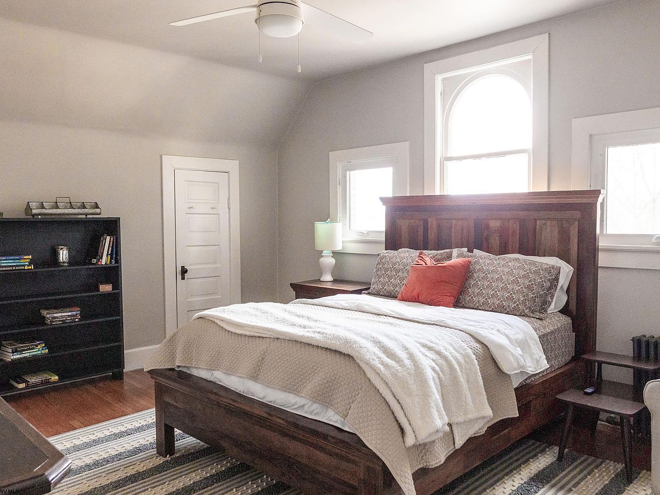 This serene master bedroom features a cozy and inviting atmosphere with its warm color palette of soft grays and rich brown tones. A beautifully crafted wooden bed, complemented by textured blankets and vibrant accent pillows, serves as the focal point. Natural light floods the space through arched windows, highlighting the elegant architectural details. Furnishings include a sleek nightstand and a functional bookshelf, ideal for family-friendly living. The layout promotes organization and relaxation, while subtle decor elements add a personal touch. A ceiling fan enhances airflow, ensuring comfort in this dreamy retreat.