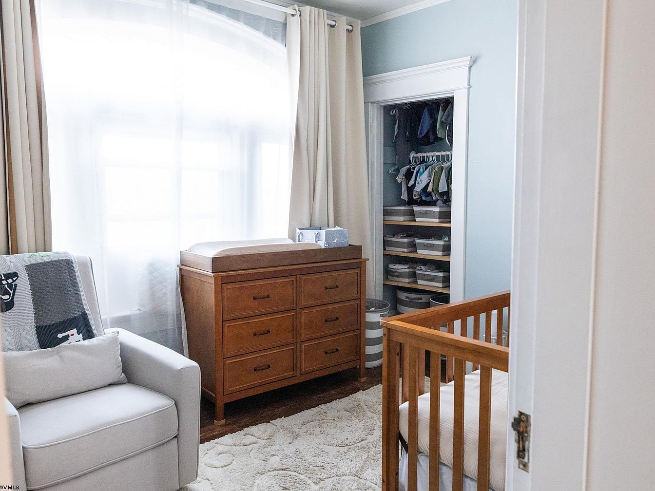This charming nursery features a soothing color palette of soft blues and natural wood tones. A cozy, plush area rug adds warmth to the space, while large, sheer curtains allow abundant natural light to filter through, creating an airy ambiance. The well-placed changing table stands beside a comfortable armchair, ideal for late-night feedings or cuddles. Storage solutions are thoughtfully incorporated, with a closet filled with neatly organized clothing and essentials. The wooden crib complements the changing table, establishing a harmonious look. This inviting corner emphasizes functionality and comfort, making it a perfect haven for both parents and their newborn.