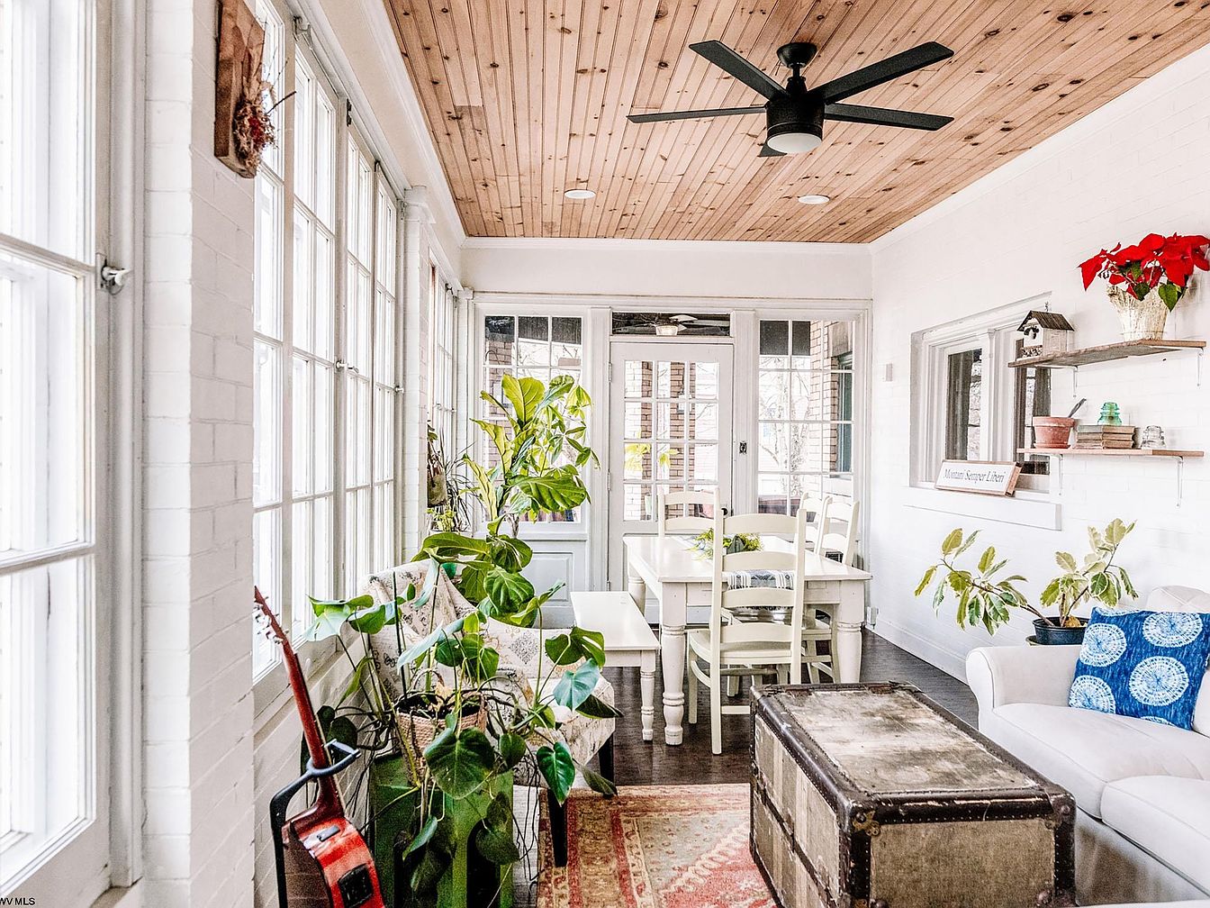 This inviting sunroom features a harmonious blend of natural light and cozy aesthetics, making it ideal for family gatherings. The layout showcases large, windows lining the walls, accented by a warm, wood-paneled ceiling that adds character. A plush, white sofa paired with colorful throw pillows invites relaxation, while an antique trunk offers charming storage. A farmhouse-style dining table sits centerstage, surrounded by painted chairs, perfect for casual meals. Lush greenery and potted plants enhance the ambiance, bringing the outdoors in. Functional ceiling fans ensure comfort, highlighting a space designed for both family living and serene retreat.