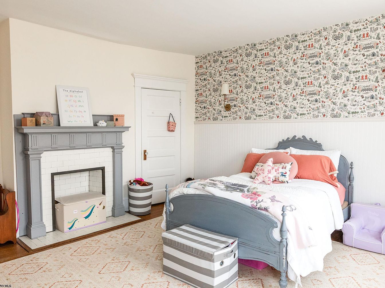 This charming kid’s bedroom features a cozy layout, with a beautifully detailed gray vintage bed that invites restful nights. The bed is adorned with playful coral and white bedding, accented by whimsical throw pillows, creating a vibrant yet soothing color scheme. A delightful patterned wallpaper showcases an enchanting scenery, sparking imagination. Architectural details include a timeless gray mantle with a tiled fireplace, paired with storage solutions like striped boxes for easy organization. The warm wooden floor and soft area rug add comfort, making this space not only stylish but also family-friendly and functional, perfect for a child’s retreat.