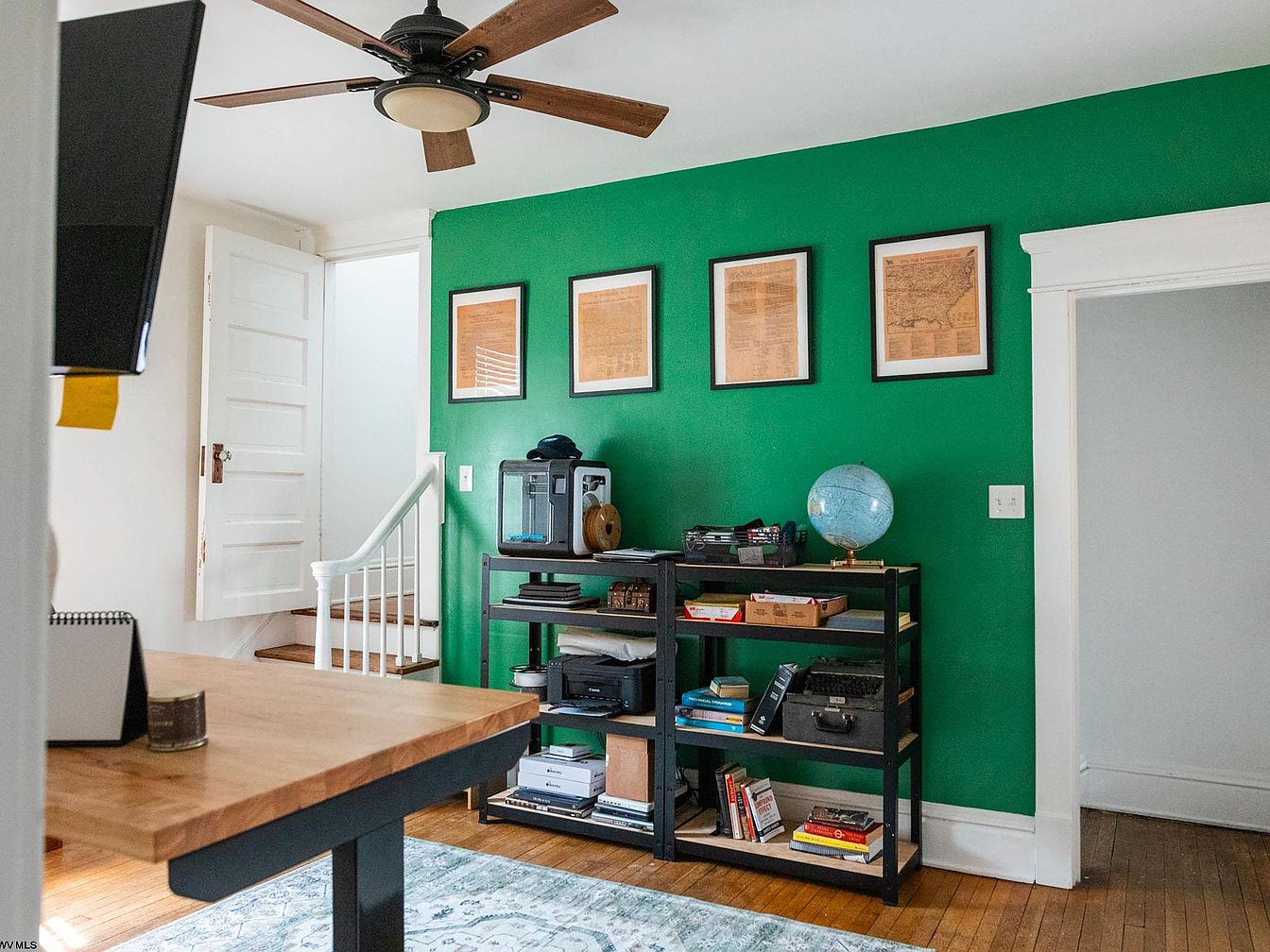 The entryway features a vibrant green accent wall that invigorates the space, complemented by classic white trim and wood flooring that adds warmth. A stylish ceiling fan provides a touch of character, while framed maps above a modern bookshelf showcase a blend of vintage and contemporary aesthetics. The bookshelf is thoughtfully arranged with books and decorative items, creating an inviting atmosphere for family and guests. The open design leads to a staircase, enhancing the airy feel. A simple wooden table with a calming candle and notebook serves as a functional welcome area, encouraging creativity and connection.