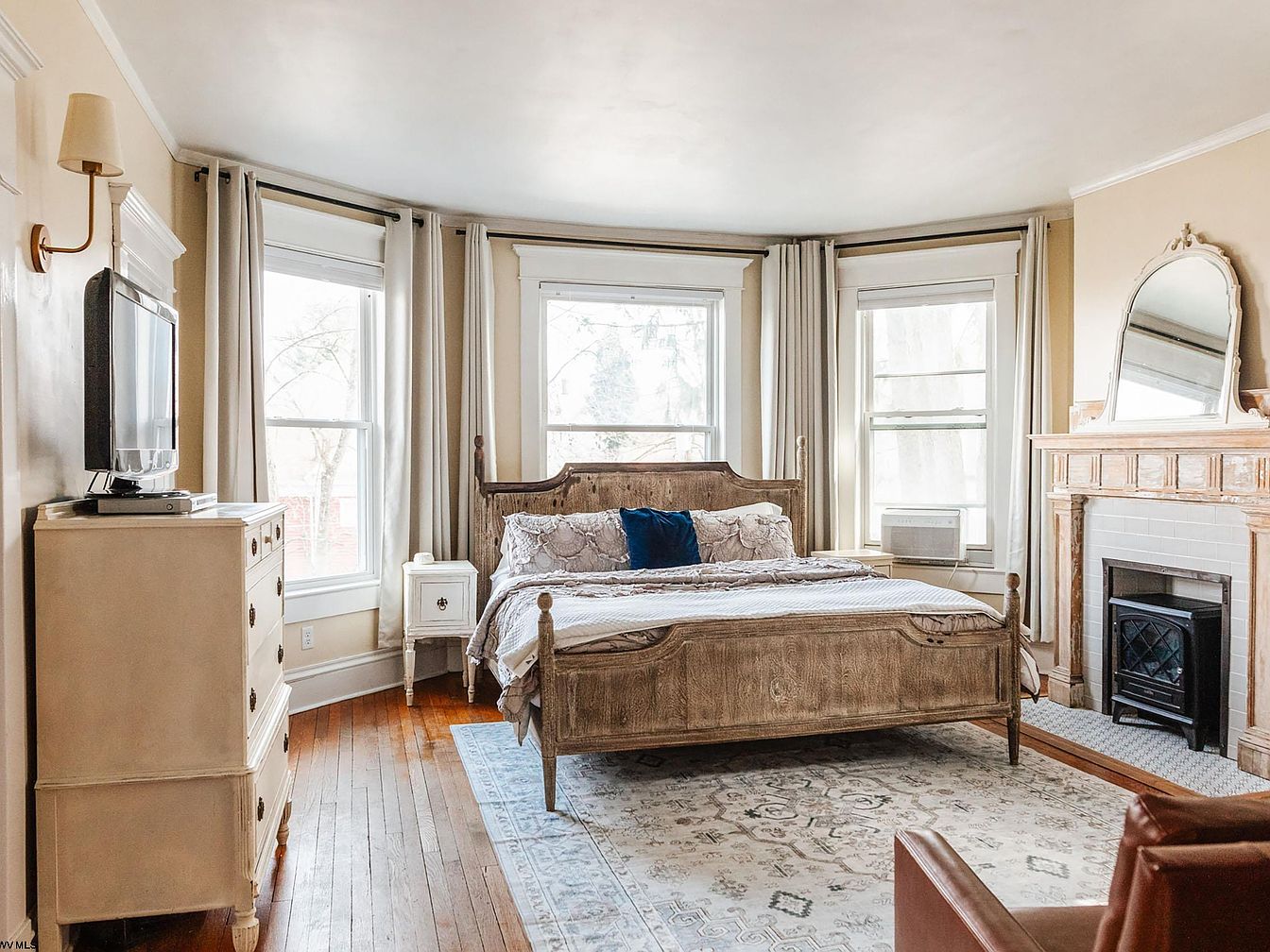 This inviting master bedroom features a cozy layout with a blend of classic and modern elements. A beautifully crafted wooden bed serves as the focal point against warm, neutral walls, complemented by rich hardwood floors. Large bay windows fill the space with natural light, adorned with soft drapes that enhance the serene atmosphere. A vintage-style TV cabinet and elegant nightstand ensure practicality, while a tasteful area rug adds comfort. Noteworthy is the charming fireplace, framed by intricate detailing, serving as a perfect spot for relaxation. The room embodies a welcoming ambiance, ideal for both tranquility and family gatherings.