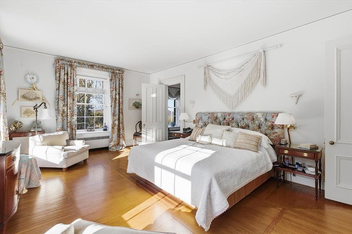This spacious master bedroom features warm hardwood flooring that complements the inviting color palette of soft whites and pastel floral accents. A plush, upholstered headboard adds a touch of elegance to the king-sized bed, adorned with decorative pillows for comfort. A cozy armchair, positioned near the window, invites relaxation while allowing ample natural light to brighten the space. Flowing drapes frame the large window, enhancing the airy atmosphere. Thoughtfully curated artwork and decorative accents reflect a serene beach vibe, making it family-friendly and perfect for unwinding at the end of the day. The architecture combines classic and modern elements.