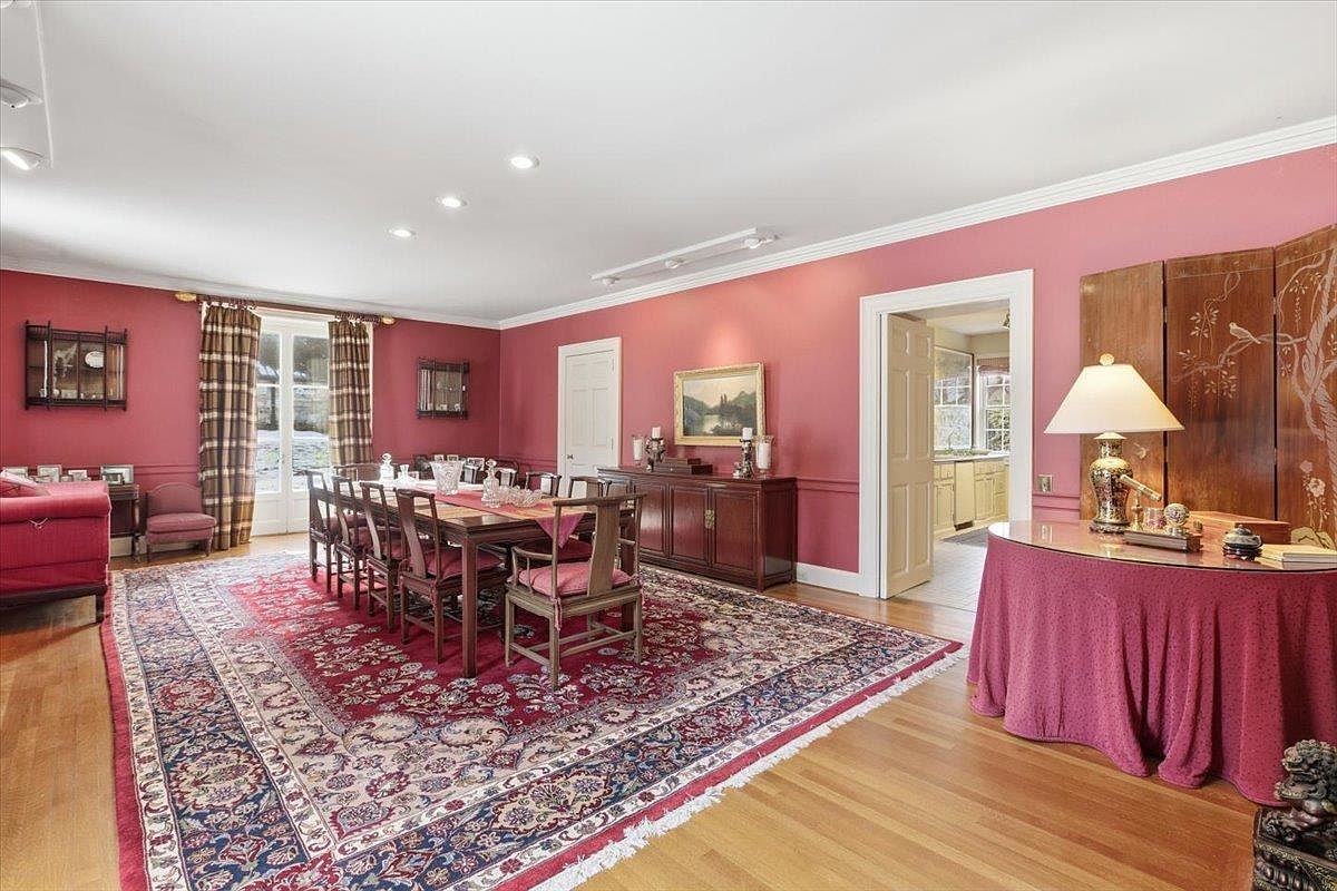 This spacious dining room features a rich red color palette, creating a warm and inviting atmosphere perfect for family gatherings. The elegant wooden dining table, surrounded by comfortable chairs with plush upholstery, invites shared meals and conversation. Architectural details like crown molding and tailored curtains accentuate the classic design, while the intricate area rug brings texture and warmth underfoot. Natural light floods the space through double glass doors, leading to the outdoors, fostering a seamless transition between indoor and outdoor living. Decorative elements like a sideboard and wall art add a touch of sophistication, enhancing the room’s charm.
