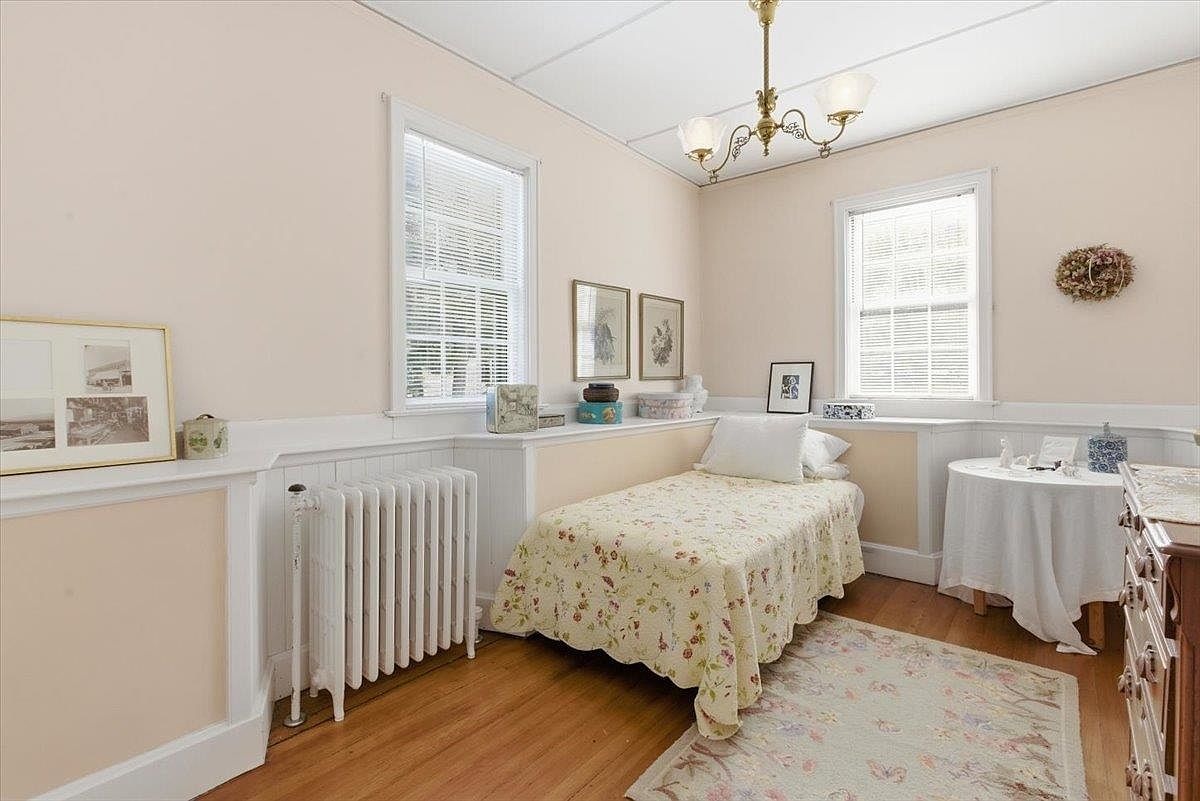 This inviting guest bedroom features a delicate floral-patterned bedspread atop a twin bed, complemented by a light, pastel color palette that enhances the warmth of the space. Natural light streams through double windows adorned with white blinds, highlighting the wood floors and creating a serene atmosphere. A charming chandelier casts soft illumination, while wainscoting adds a touch of classic elegance. Decorative accents include framed botanical prints and a quaint side table draped in a white tablecloth, showcasing personal touches. Ideal for guests or family, this room balances style with comfort, making it a welcoming retreat.