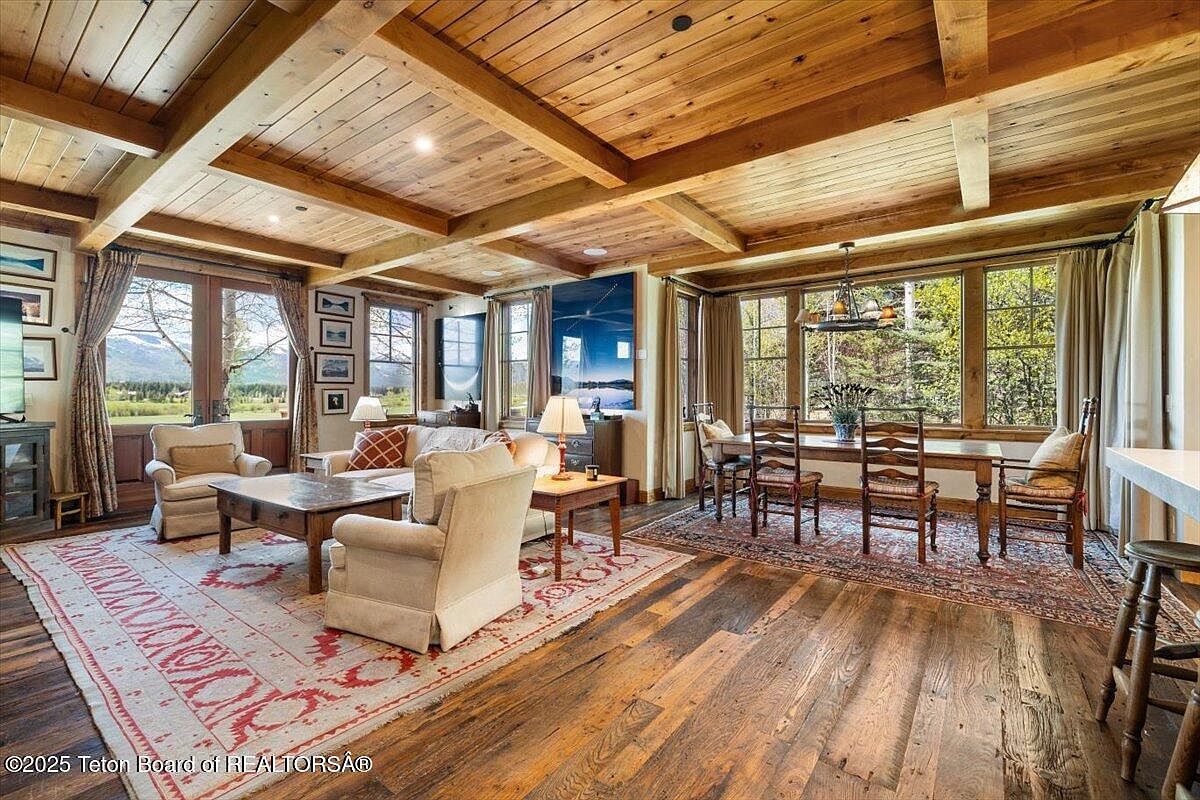 This inviting living room blends rustic charm with modern comfort, featuring exposed wooden beams and warm, rich tones. Cozy armchairs and a plush area rug create a welcoming seating area, while a sturdy wooden table surrounded by classic chairs fosters family gatherings. Large windows invite natural light, showcasing scenic views of the outdoors. The soft beige and earthy color palette enhances the warmth, complemented by contemporary decor and thoughtfully placed artwork. The open layout encourages social interaction, making it a perfect space for relaxing or hosting. Elegant drapes and subtle lighting add to the room’s tranquil ambiance.
