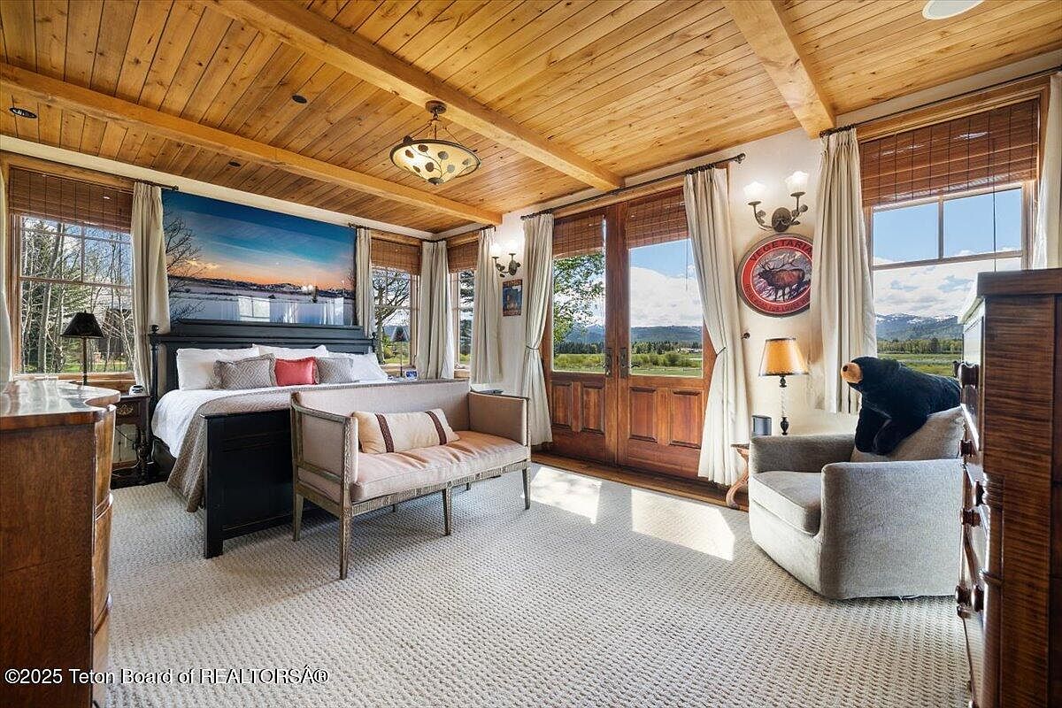 This master bedroom exudes warmth and charm, featuring a high vaulted ceiling adorned with rich wooden beams. The color palette consists of soft neutrals and earth tones, enhancing the inviting atmosphere. A plush queen bed with a white quilt rests at the center, complemented by cozy armchairs that offer a perfect reading nook. Large French doors open to picturesque views, bathing the room in natural light. Decorative artwork, including a framed jersey, personalizes the space, while the elegant dresser and side tables offer practical storage solutions. This serene retreat is designed for comfort and relaxation, ideal for unwinding.